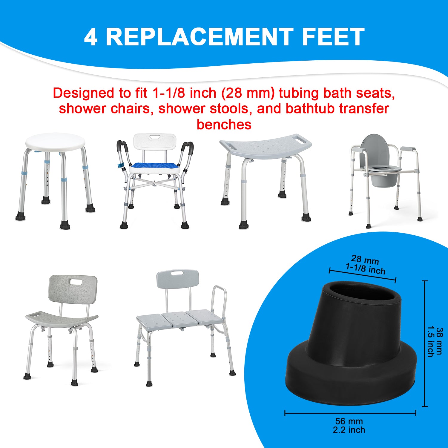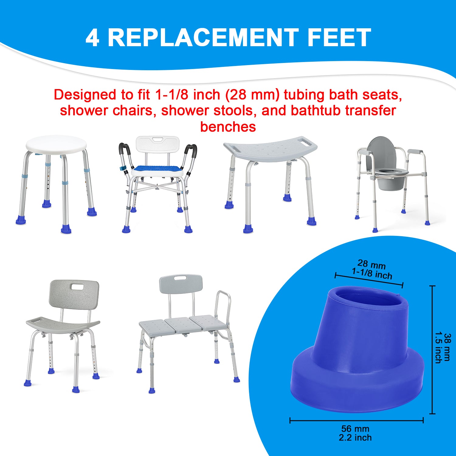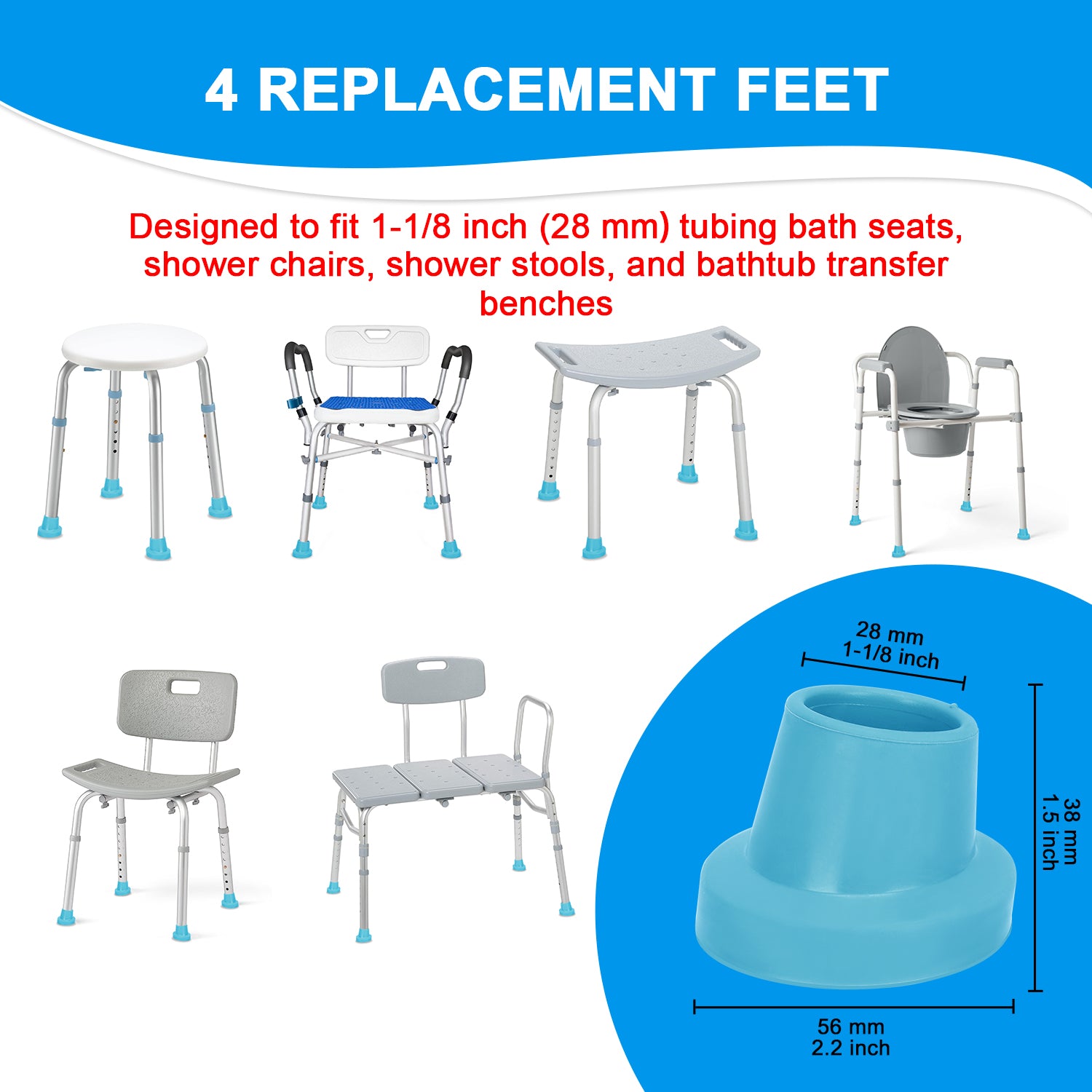 - 4 Replacement Feet: with an inside diameter of 1-1/8 inch , these feet are designed to fit 1-1/8 inch tubing bath seats, shower chairs, shower stools, and bathtub transfer benches