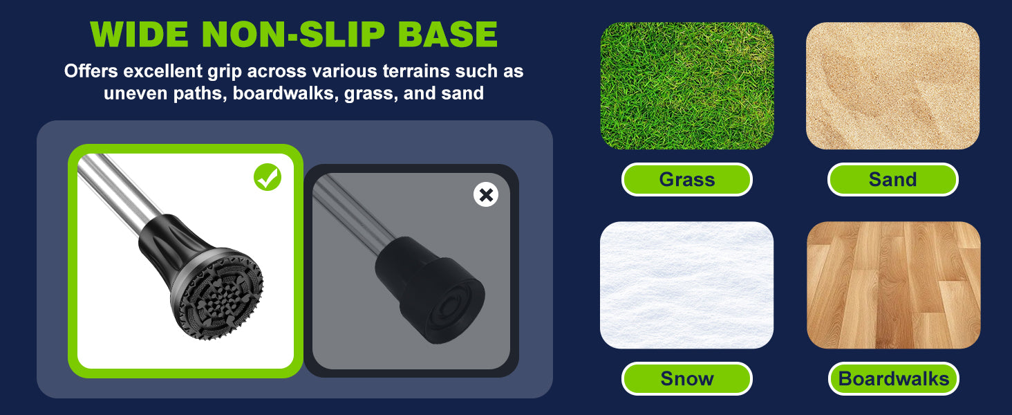 - Enhanced Traction and Comfort: the wide non-slip base offers excellent grip across various terrains such as uneven paths, boardwalks, grass, and sand, while the integrated shock-absorbing system significantly reduces the impact on the user's hands and wrists for a smoother experience