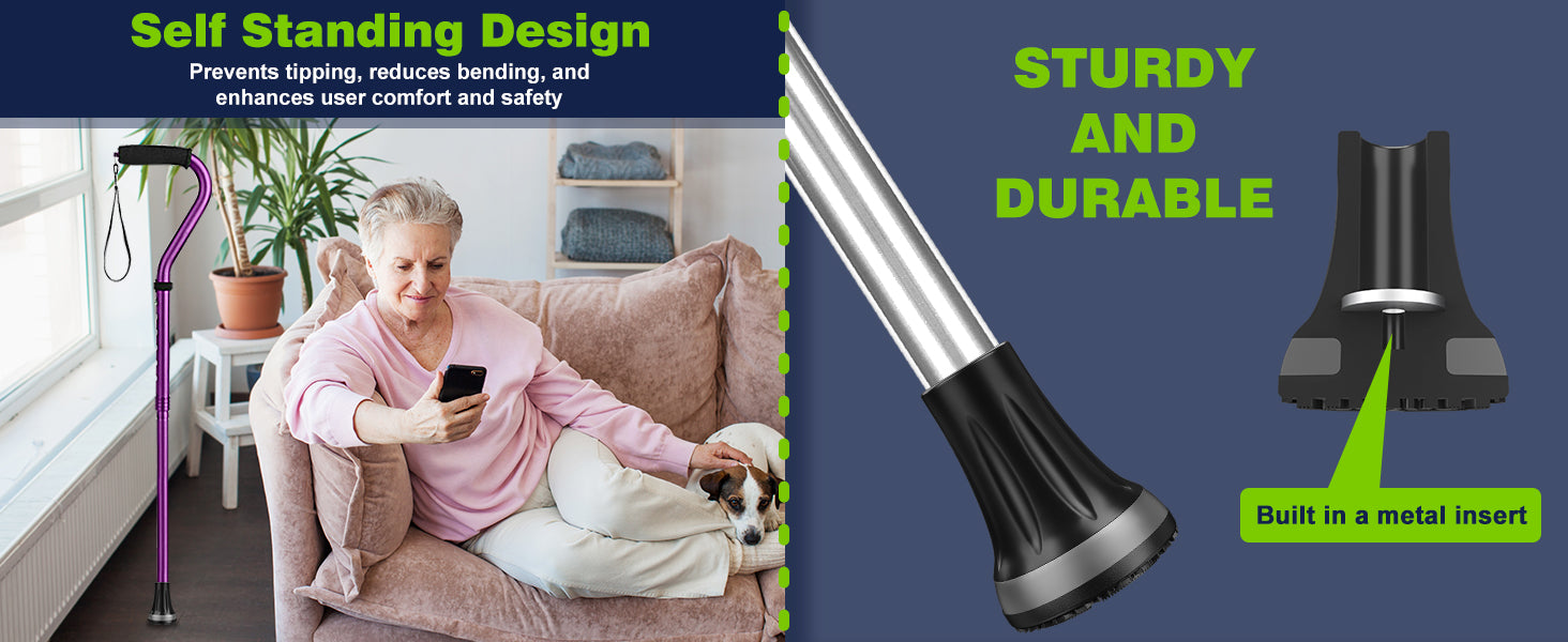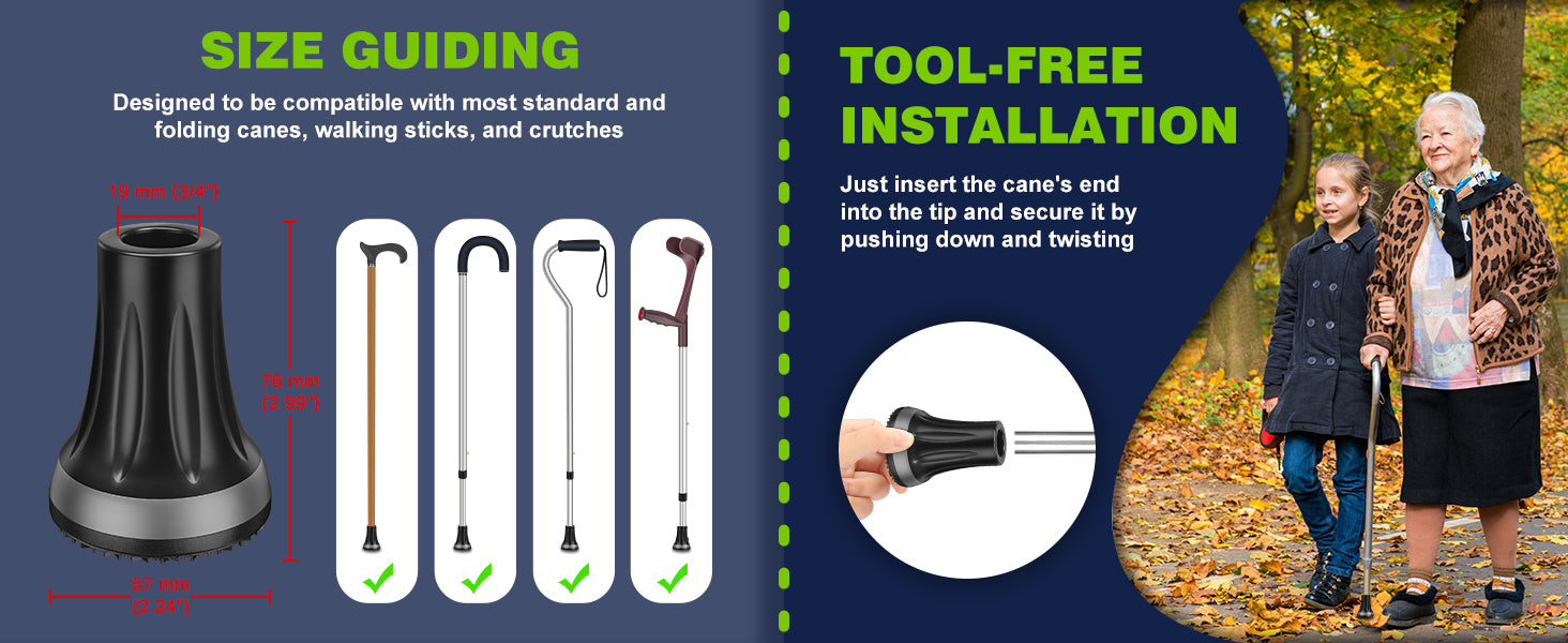 - Tool-Free Installation: no tools required; just insert the cane's end into the tip and secure it by pushing down and twisting, using a wall or floor for additional stability during installation