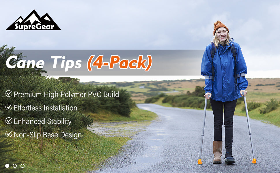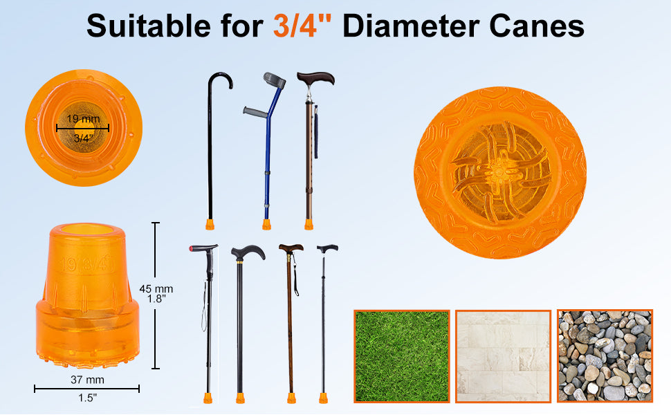 - 4-Pack 3/4 Inch Cane Tips: designed to fit a wide range of standard walking canes, folding canes, and crutches with 3/4 Inch leg diameter; SupreGear Warranty: 1 month hassle free return and 1 year limited warranty (free replacement & shipping fee not included)