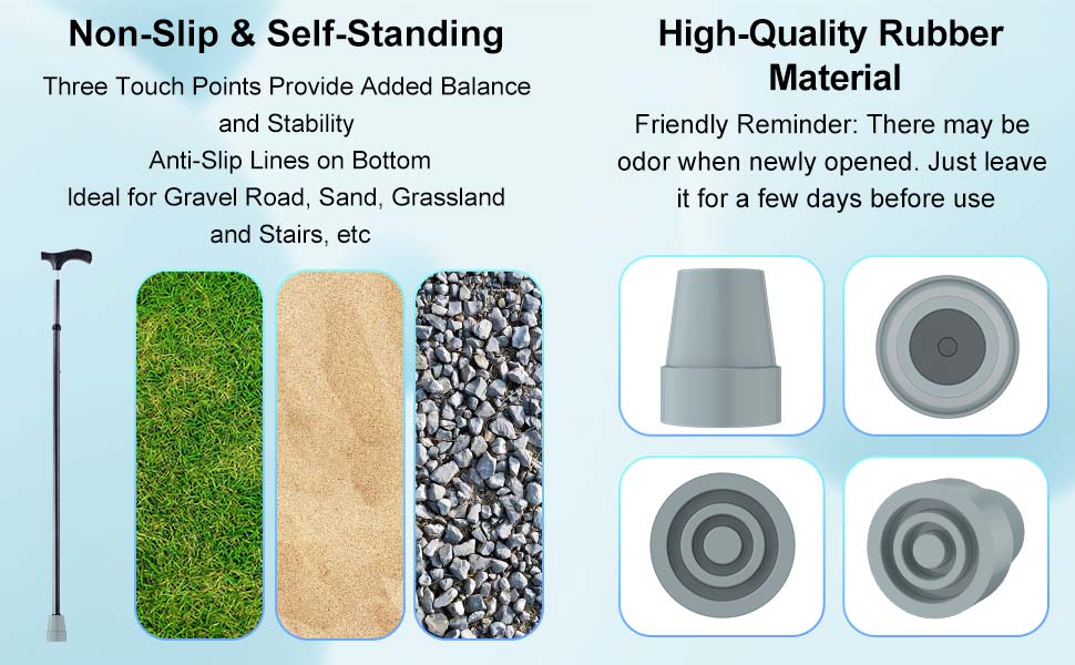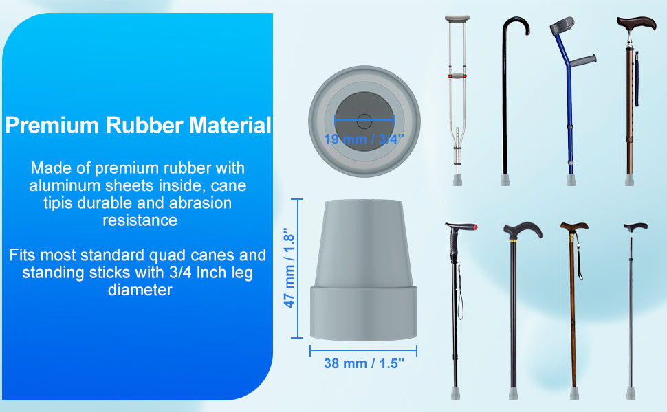 - High Quality Materials: made of premium rubber and reinforced with metal insert, these cane tips are sturdy, durable, and resistant to abrasion, low temperature and deformation, providing greater traction and preventing slippage