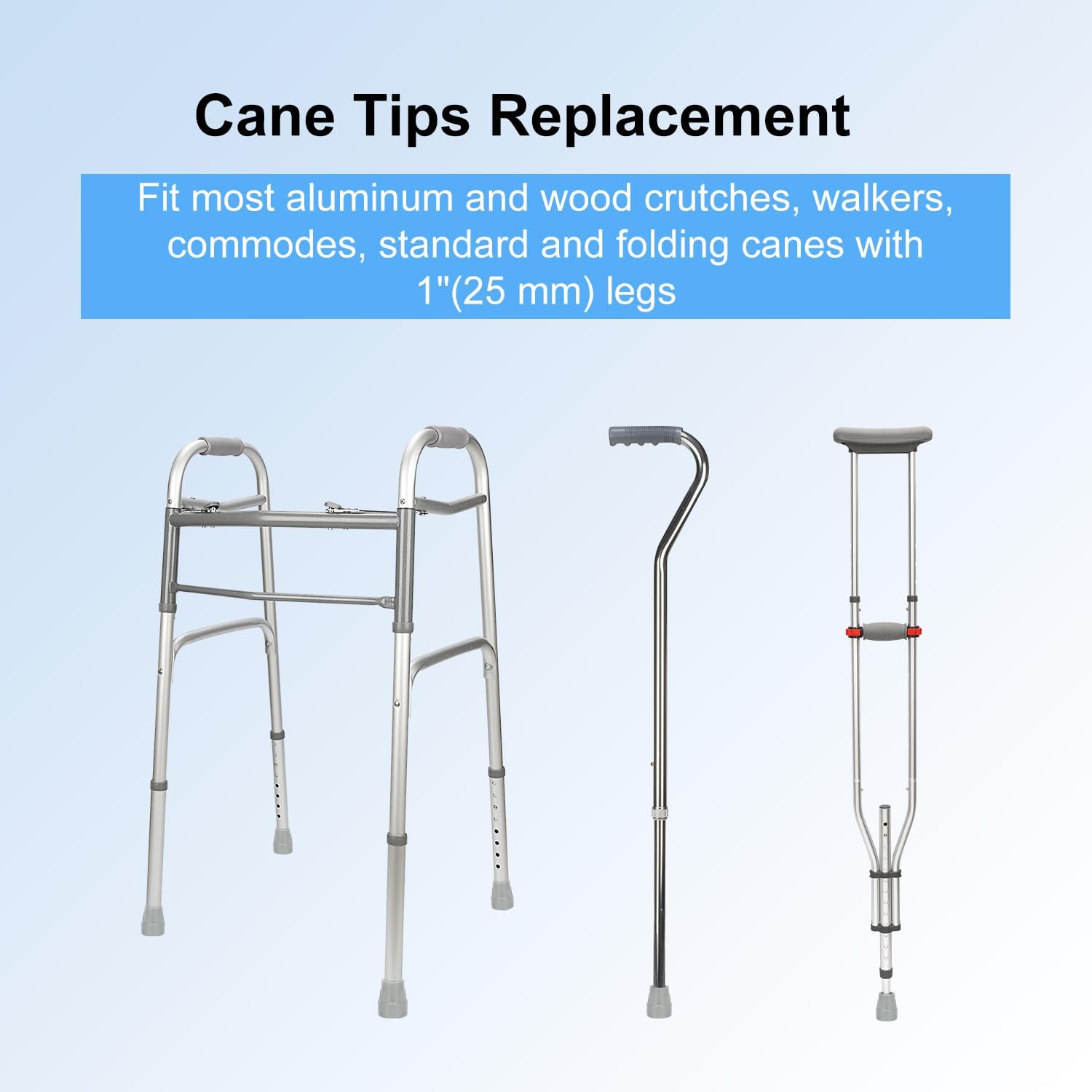 - Cane Tips Replacement: 4pcs cane tips 1 inch included, fit most aluminum and wood crutches, walkers, commodes, standard and folding canes with 1" legs