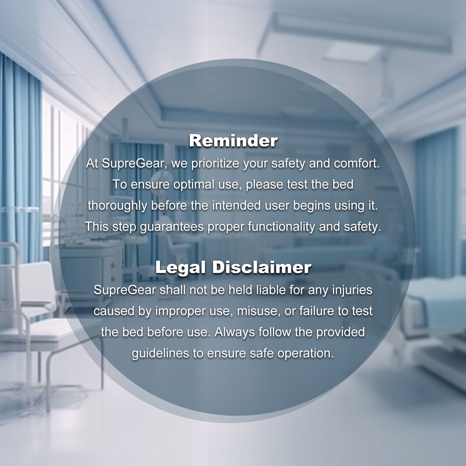 Reminder: At SupreGear, we prioritize your safety and comfort. To ensure optimal use, please test the bed thoroughly before the intended user begins using it. This step guarantees proper functionality and safety.