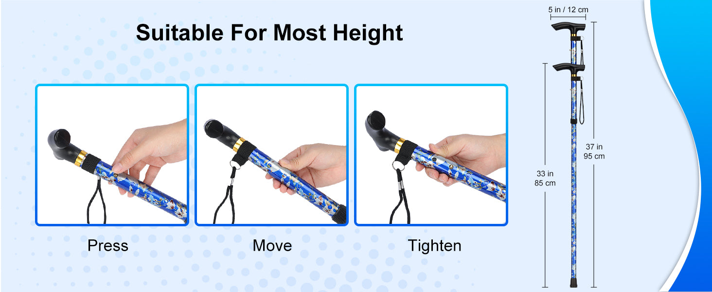 - Adjustable Height: customize the cane's height according to your preference with 5 different settings, ranging from 33 to 37 inches; to determine the appropriate cane height for you, measure the distance from your wrist joint to the floor
