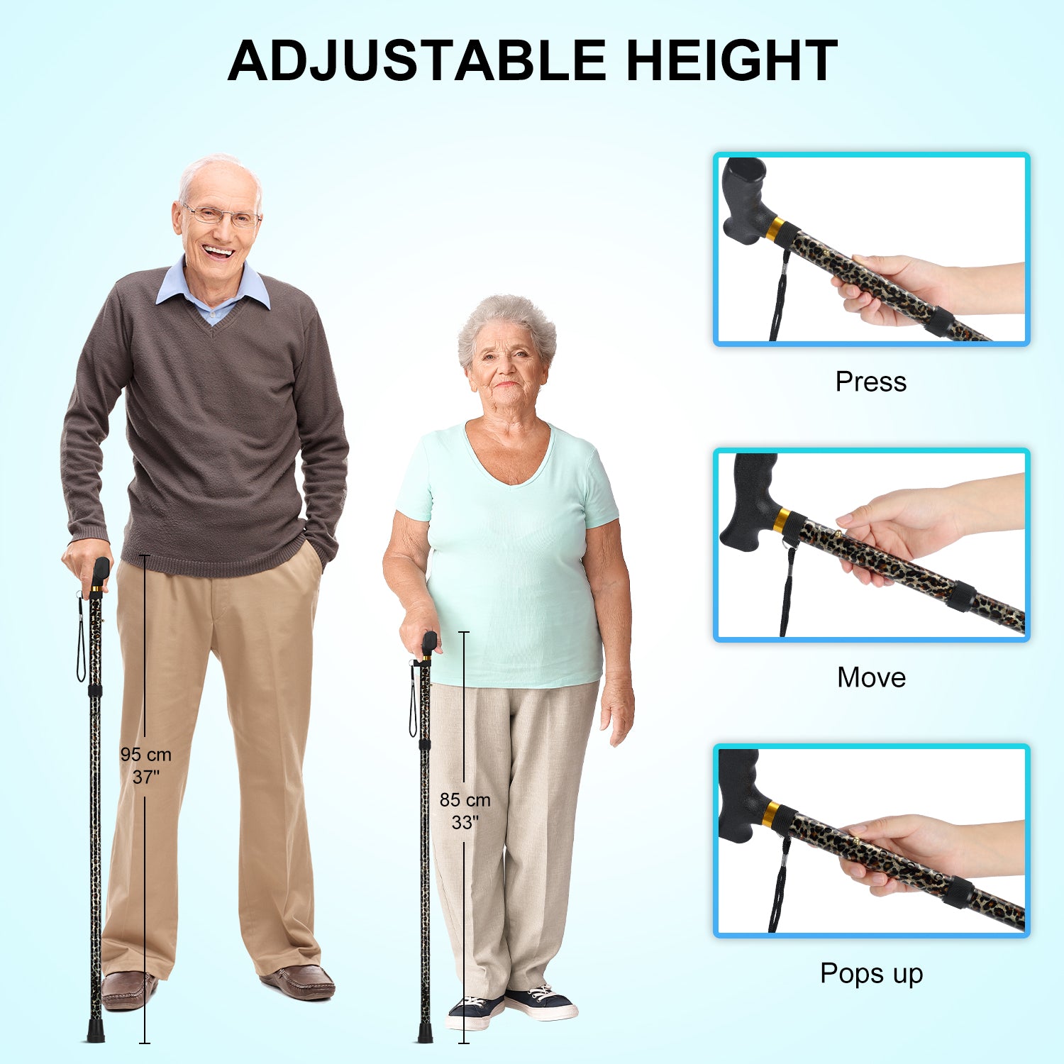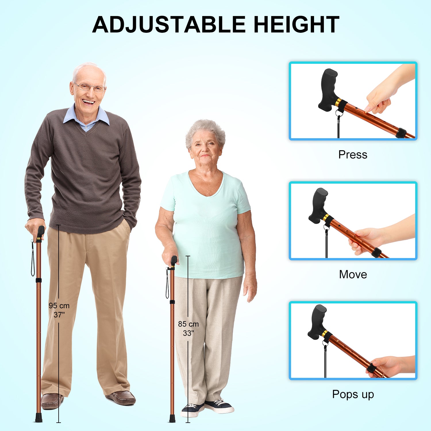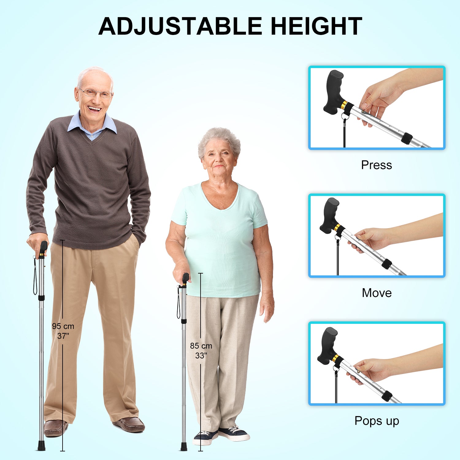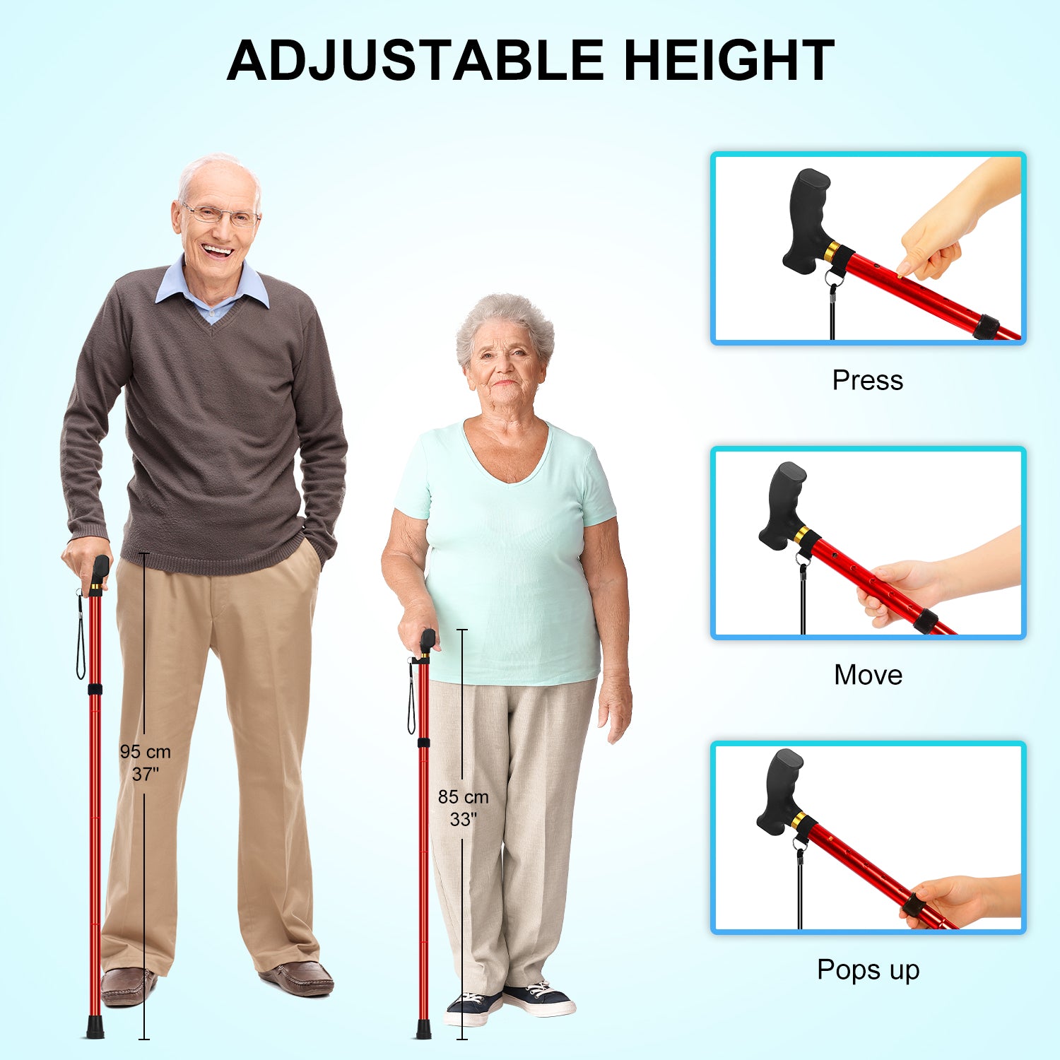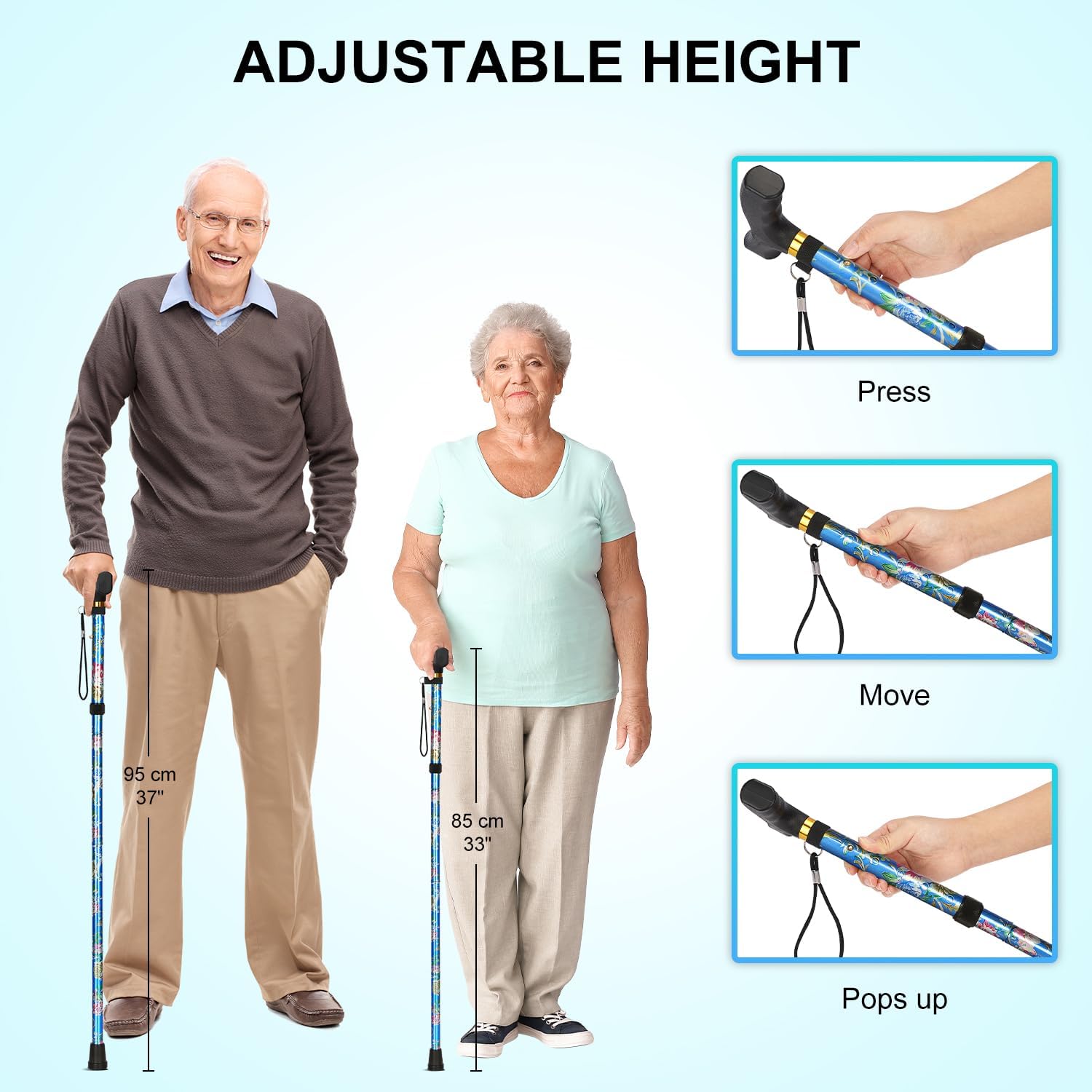 • Adjust the cane's height to your personal preference using the 5 different settings, ranging from 33 to 37 inches to ensure the proper cane height for you, please measure the distance from your wrist joint down to the floor