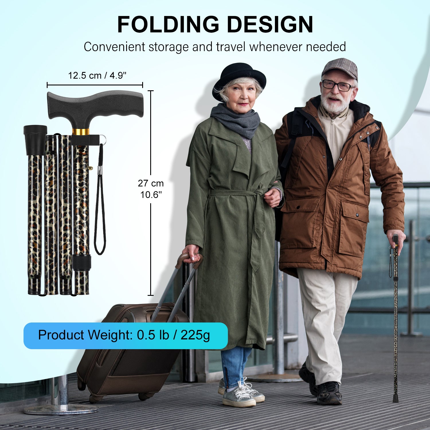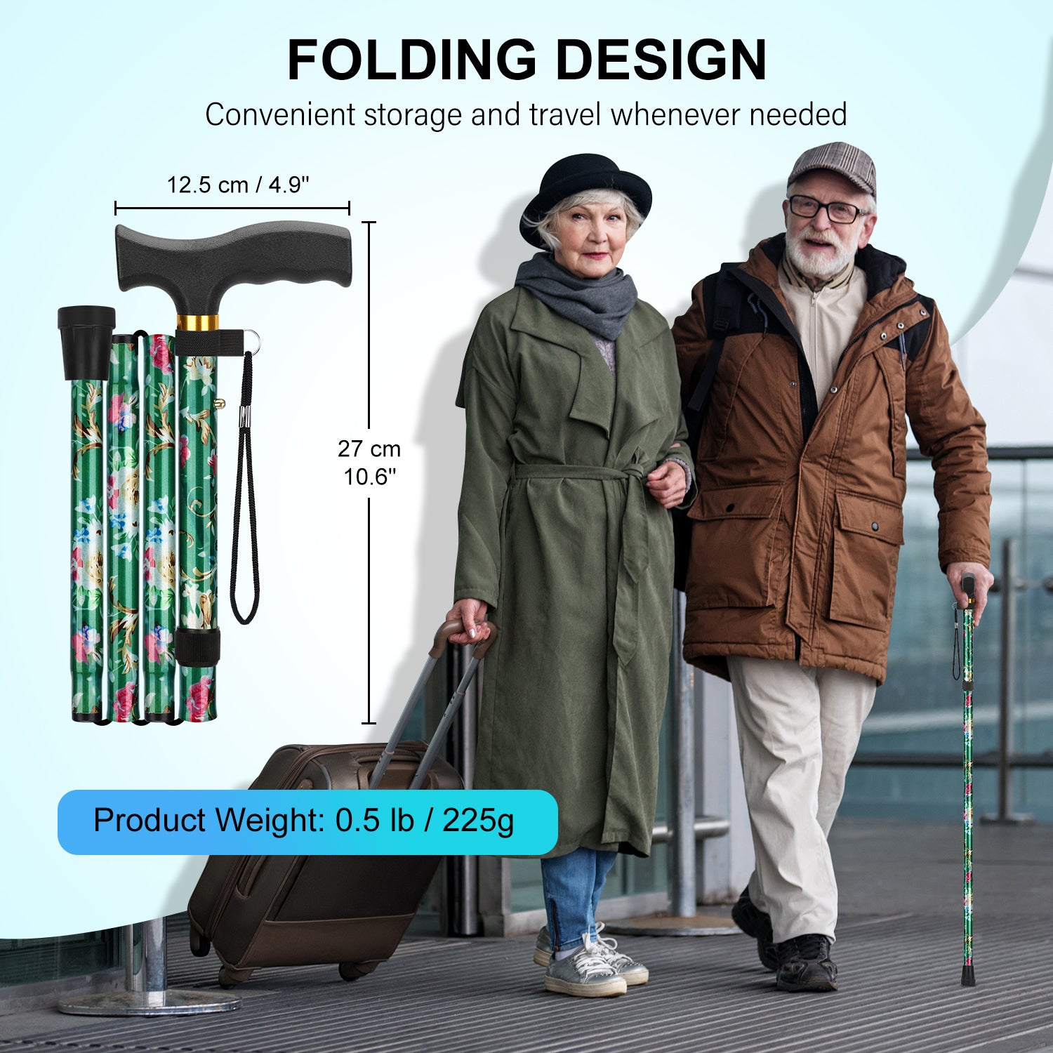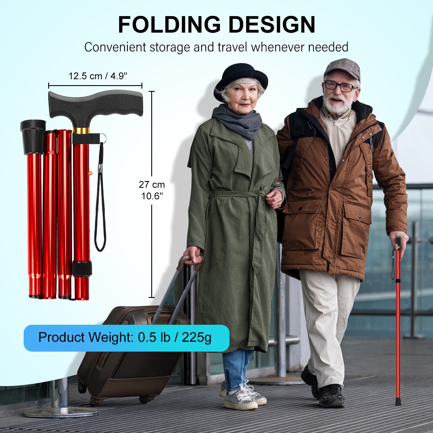 • Easily fold our SupreGear Folding Cane into 4 sections with a 10 inches length, making it compact for convenient storage and travel whenever needed; it effortlessly flips back out securely for continued, safe use; this feature makes it ideal for use by the elderly, disabled, injured individuals, men, or women, both indoors and outdoors