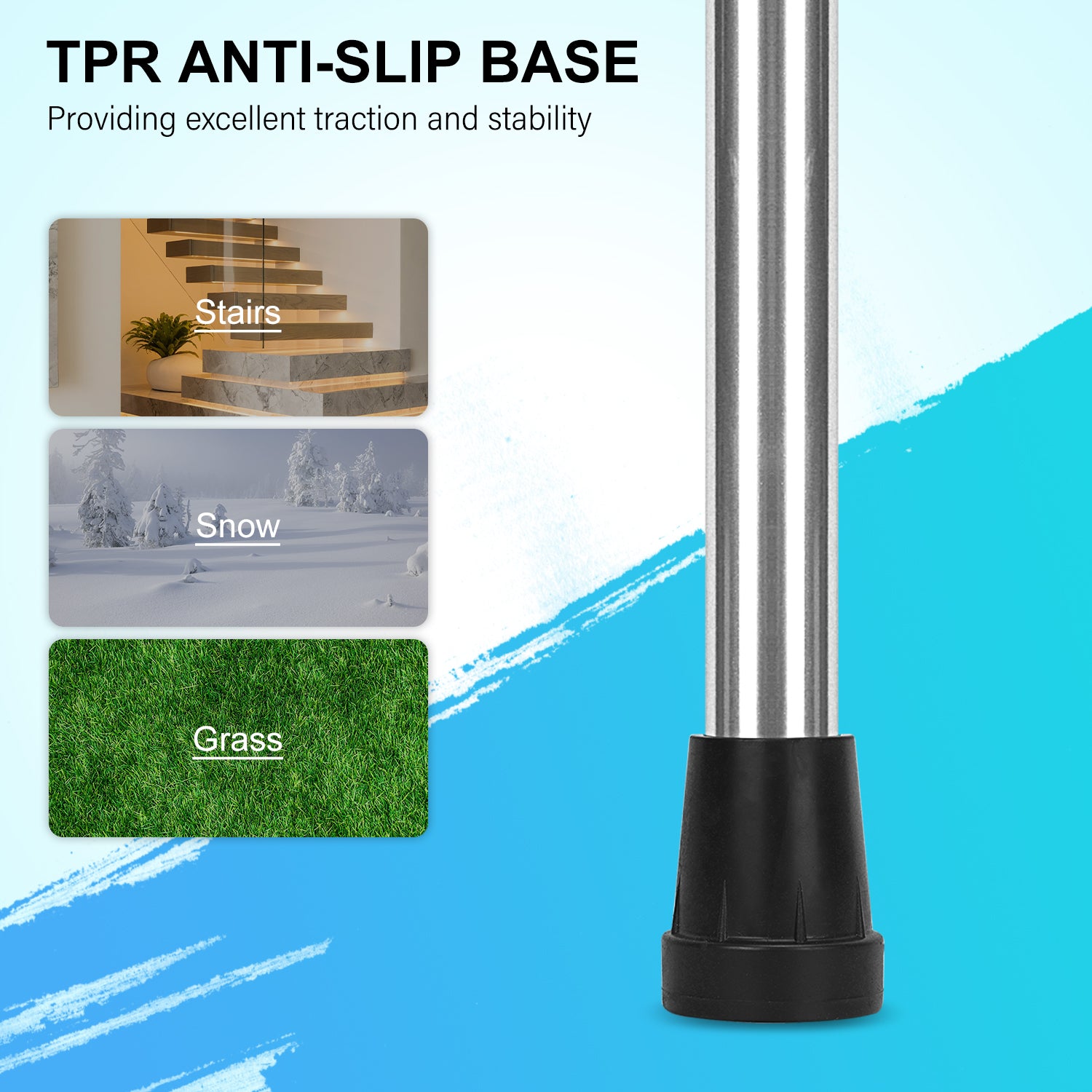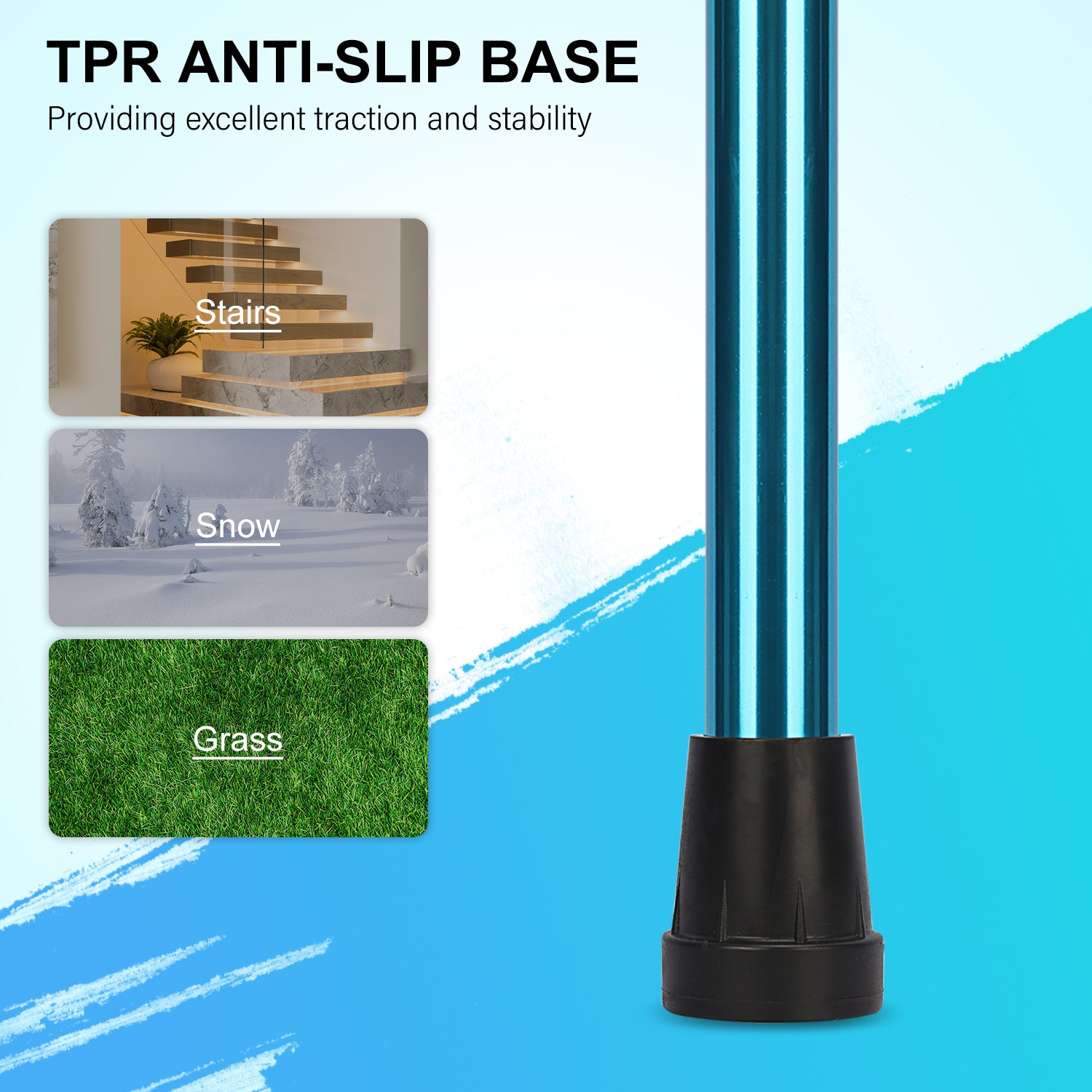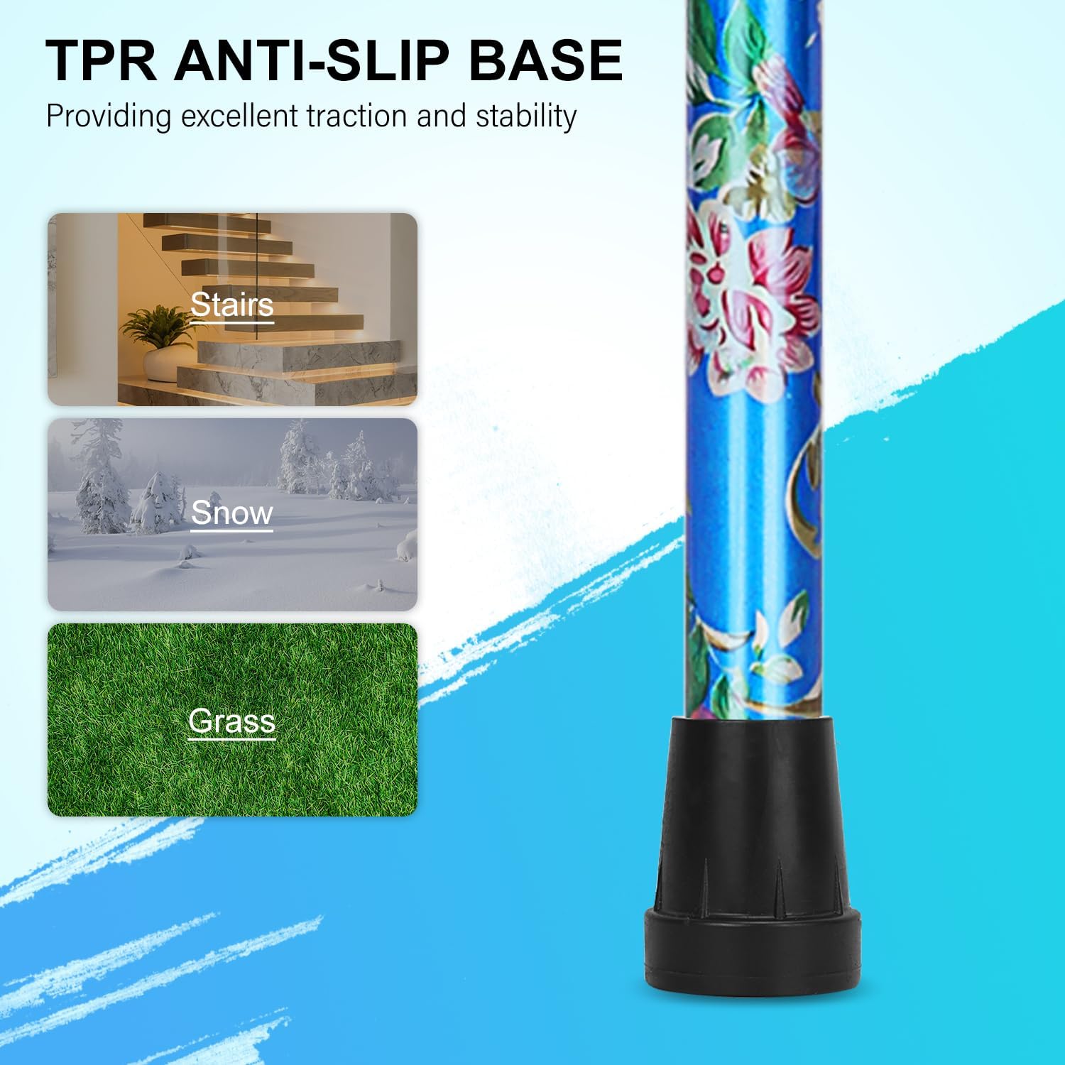 • The tip is composed of durable TPR anti-slip material, providing excellent traction and stability; it can be replaced with other types of cane tips to meet various requirements
