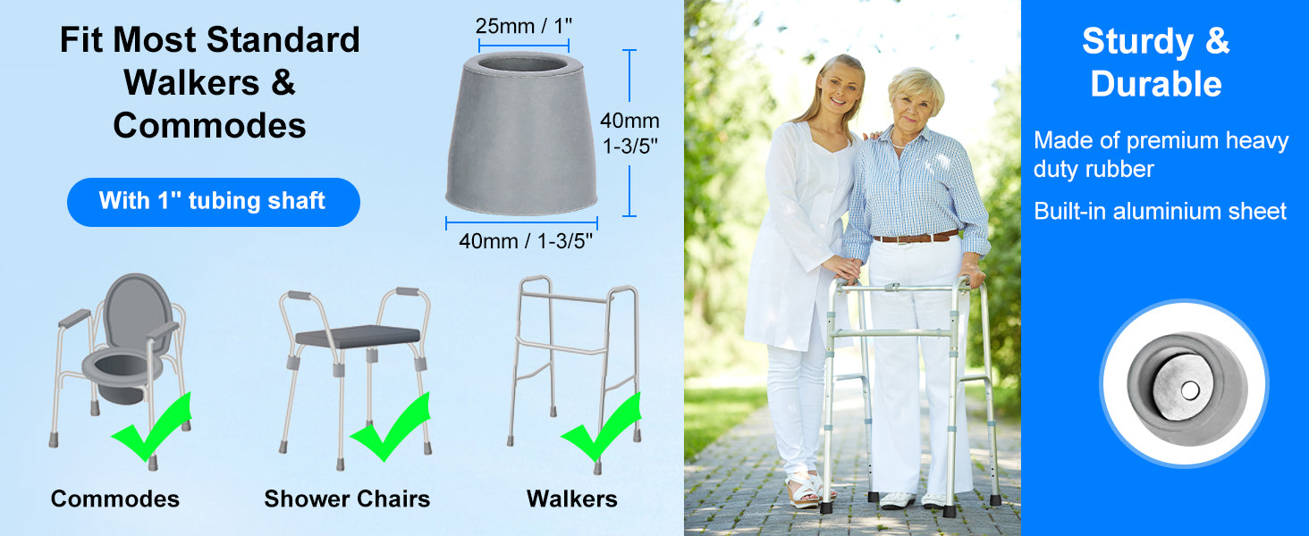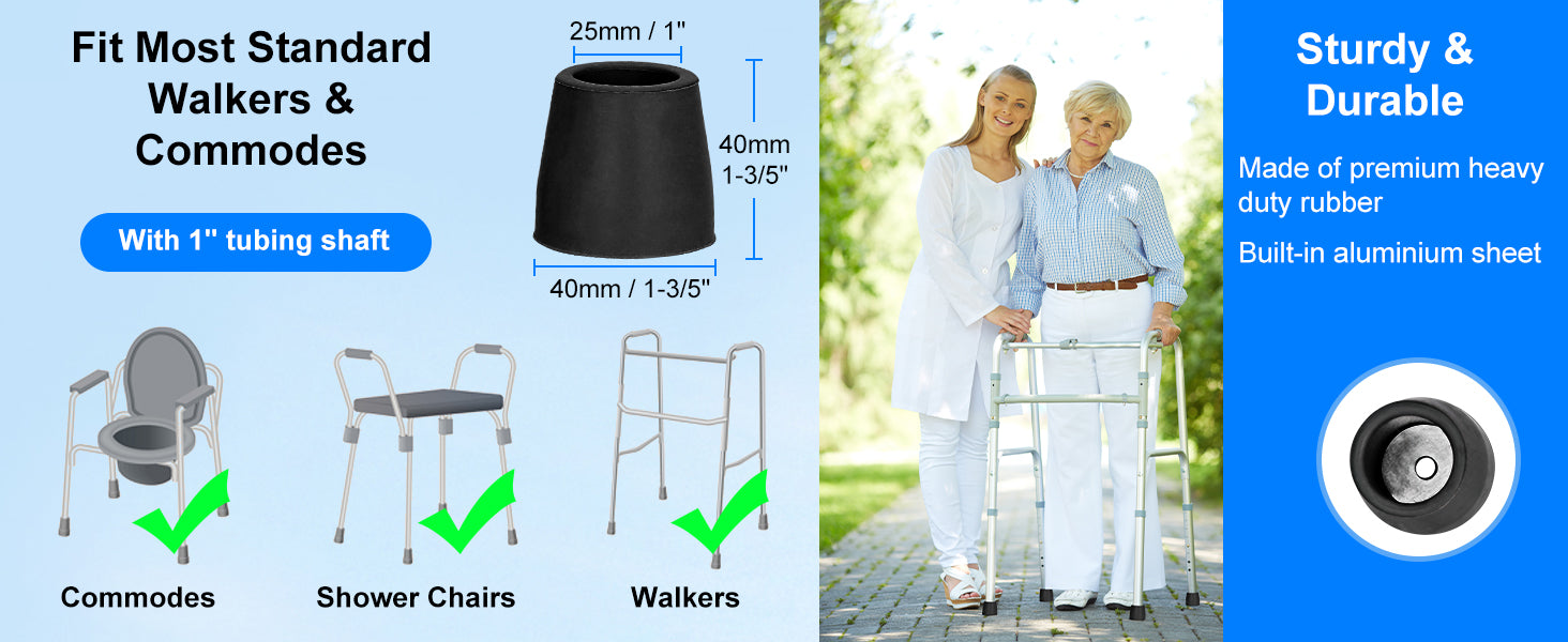 - Universal Fit: this set of 8-pack walker tips is designed to fit most standard walkers and commodes with 1 inch tubing shaft