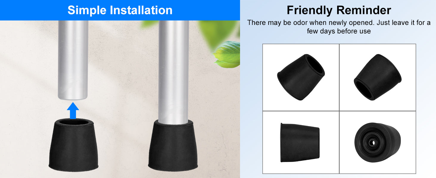 The first thing I noticed when I got these was the smell of rubber. As it happens, I like that smell so was happy with that. They are quite sturdy too with a metal disc reinforcing the inside of the base. This will take some of the strain from the rubber feet and prolong their life. Fairly easy to put on although they need to be a tight fit, otherwise, they would fall off your item! I used them on my shower seat and they were perfect for that. A good buy.