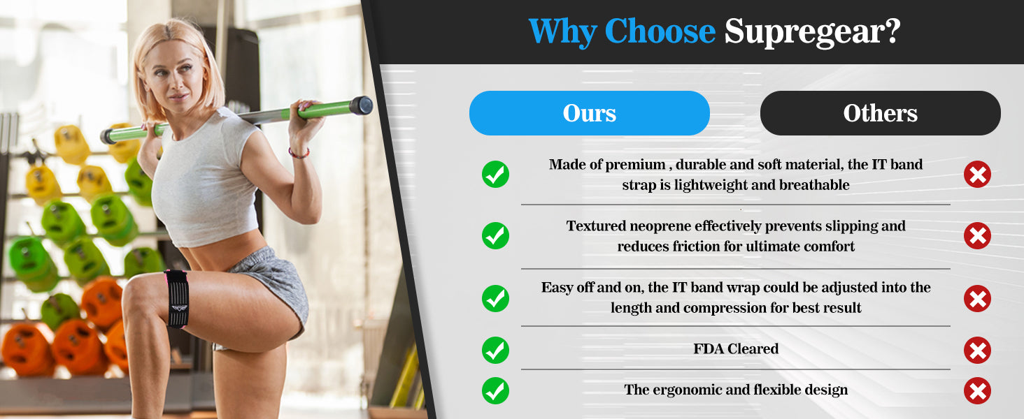 - Stabilize the Iliotibial Band: Our SupreGear IT Band Strap provides support and targeted compression above the knee area to stabilize the Iliotibial tract, great for helping reduce symptoms stemming from Iliotibial Band Syndrome as well as relieve stress and pain