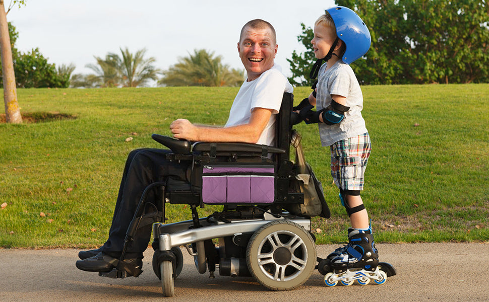 My mom is a nursing home patient. Though she had a small bag to hang on her wheel chair, she now has room for additional items that are more easily accessible to her. Very pleased.