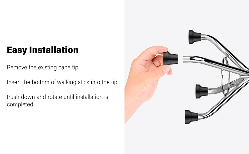 - Easy to use as a replacement for original or add-ons; simply remove the existing cane tip, insert the bottom of walking stick into the tip, push down and rotate until installation is completed