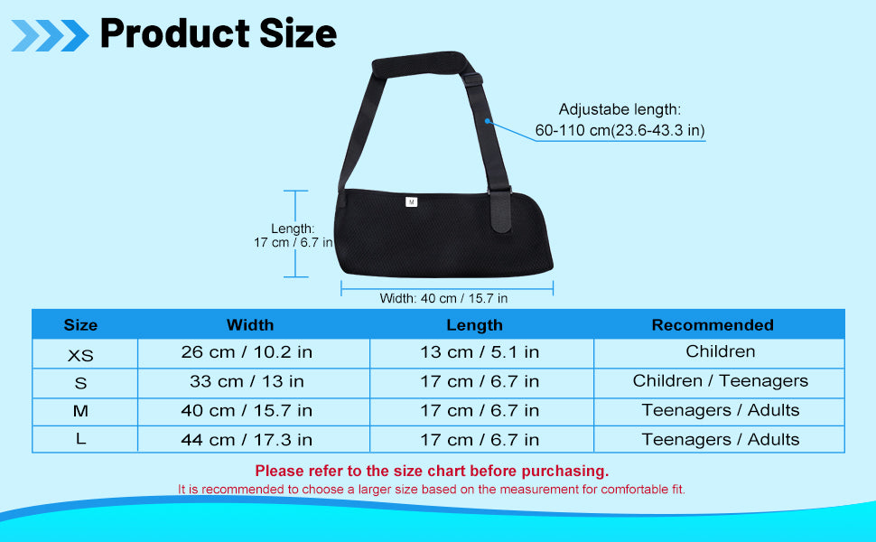 - Multiple Sizes: available in 4 sizes; please refer to the size chart before purchasing; choosing the right size sling will help fit your arm better and promote healing