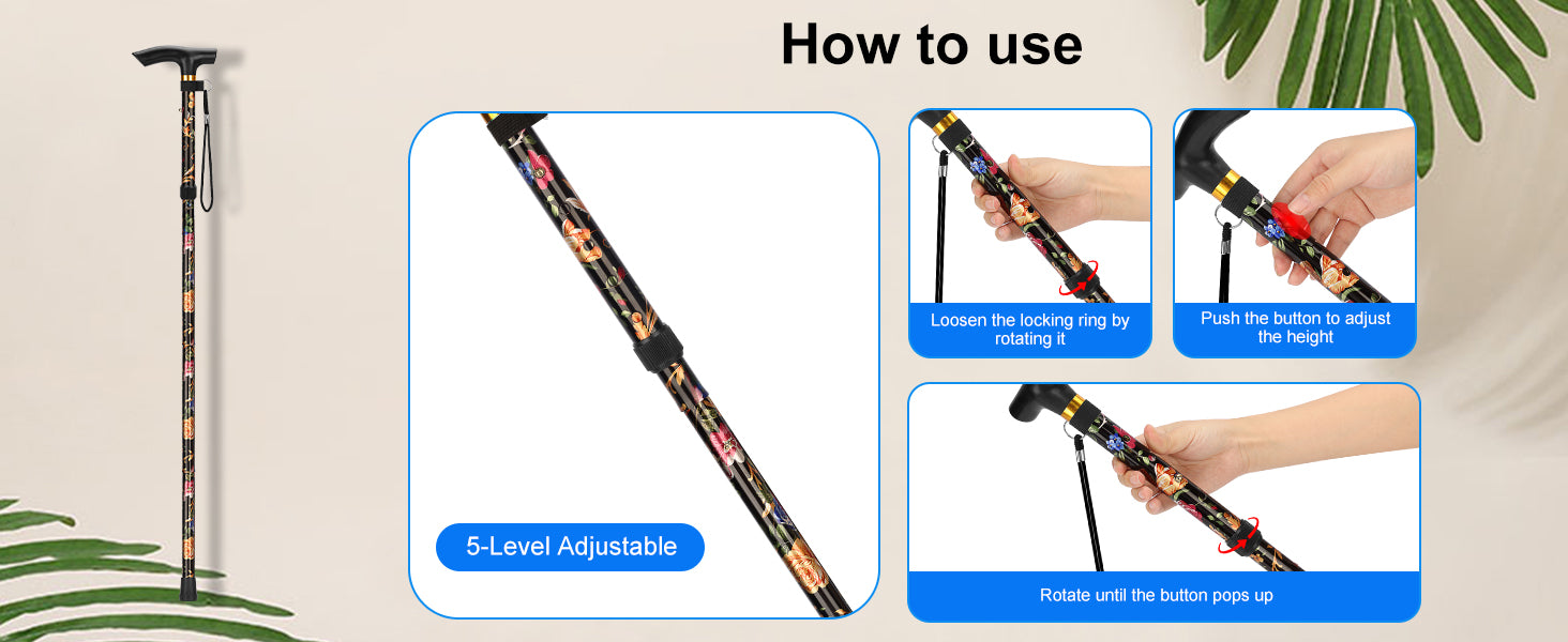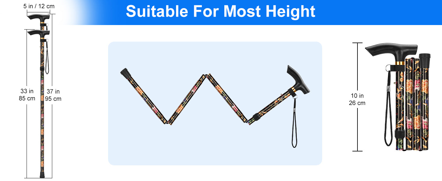 • Adjust cane height to your personal preference from 33 to 37 inch in 5 different settings; please measure the distance from your wrist joint down to the floor and this should be the proper cane height for you