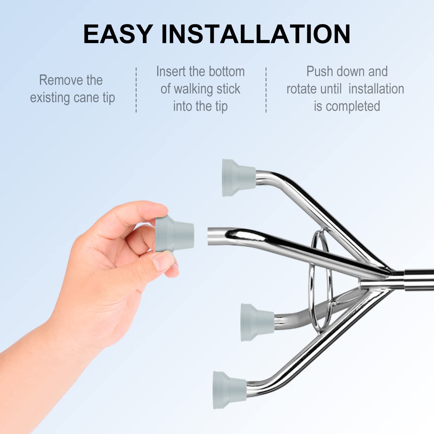 - Easy to use as a replacement for original or add-ons; simply remove the existing cane tip, insert the bottom of walking stick into the tip, push down and rotate until installation is completed