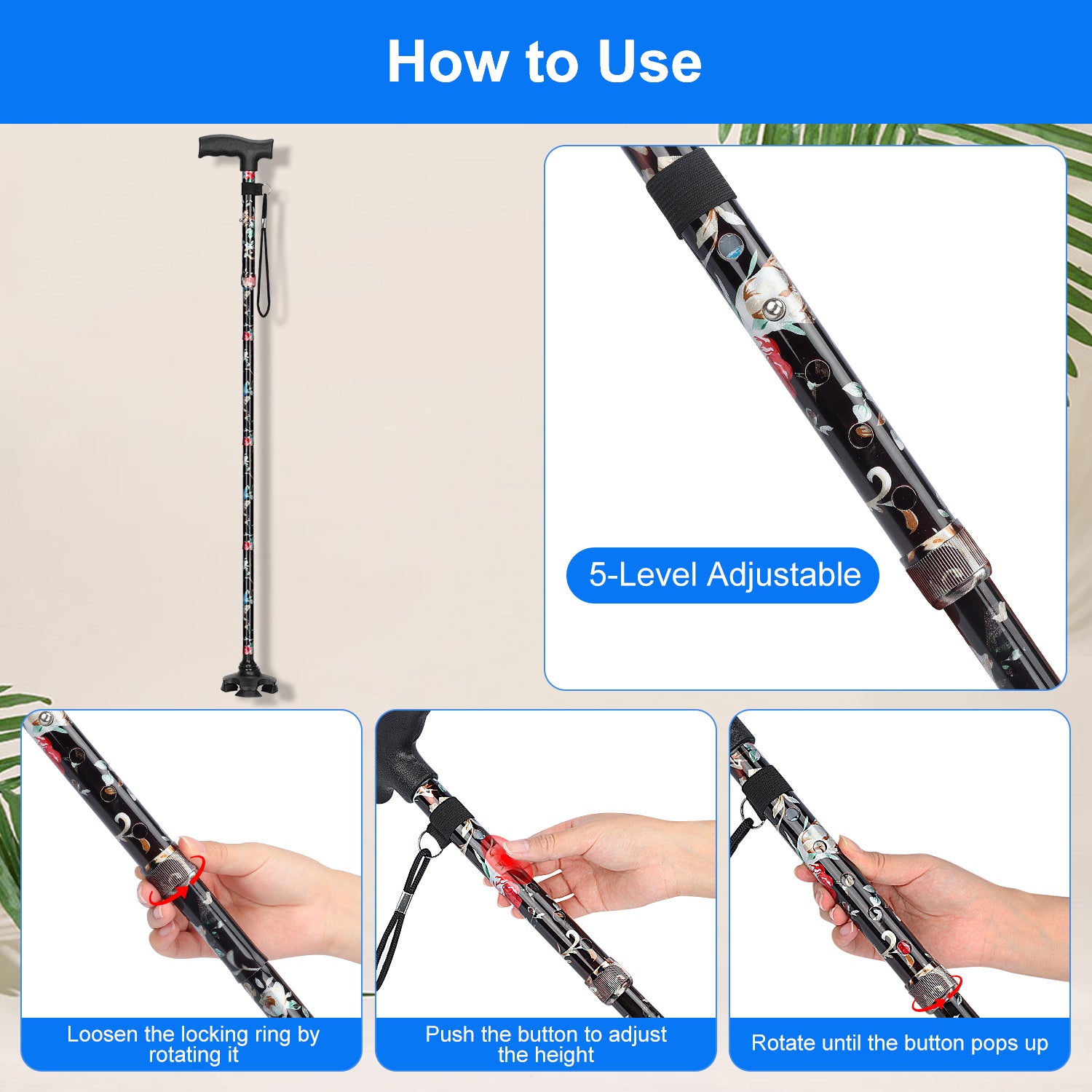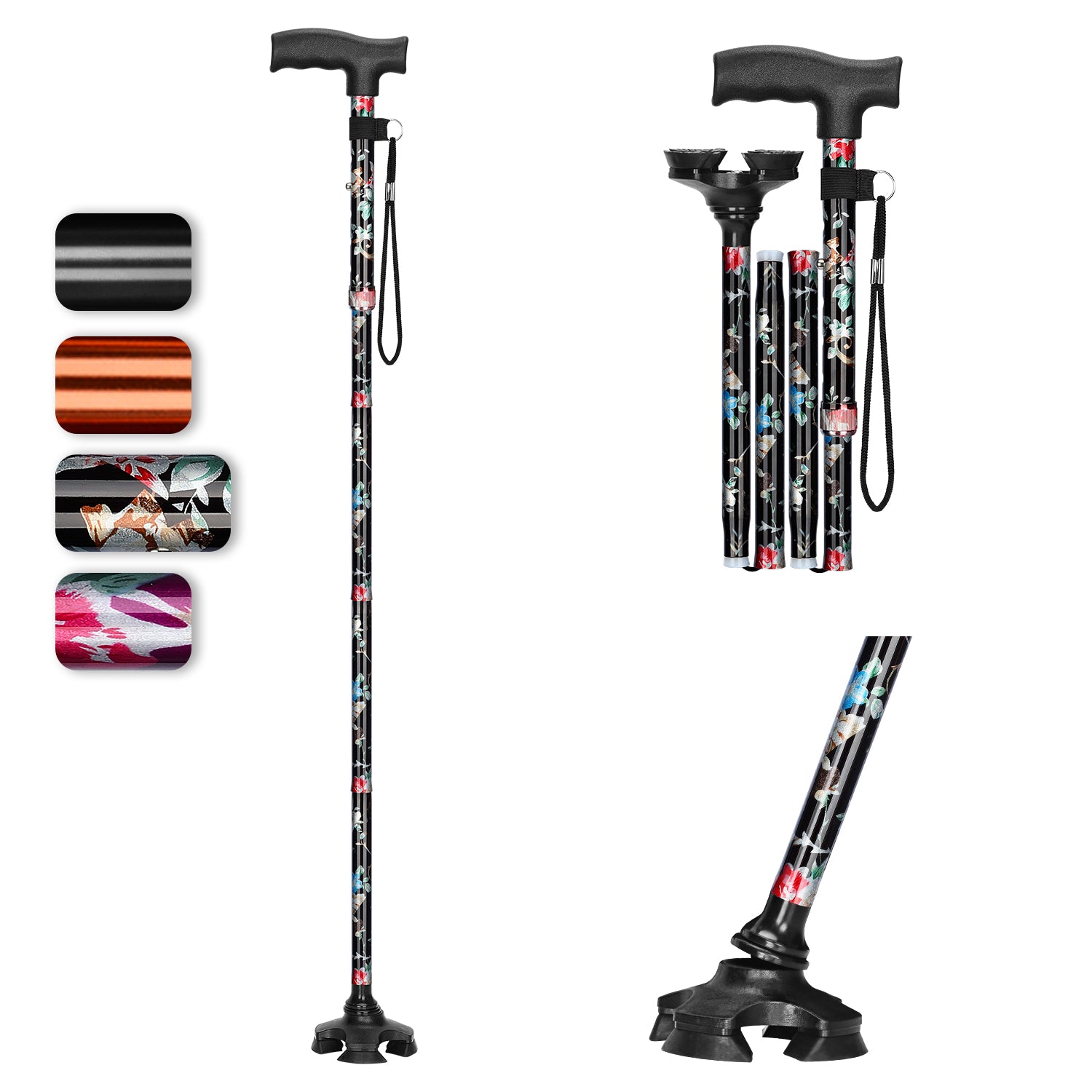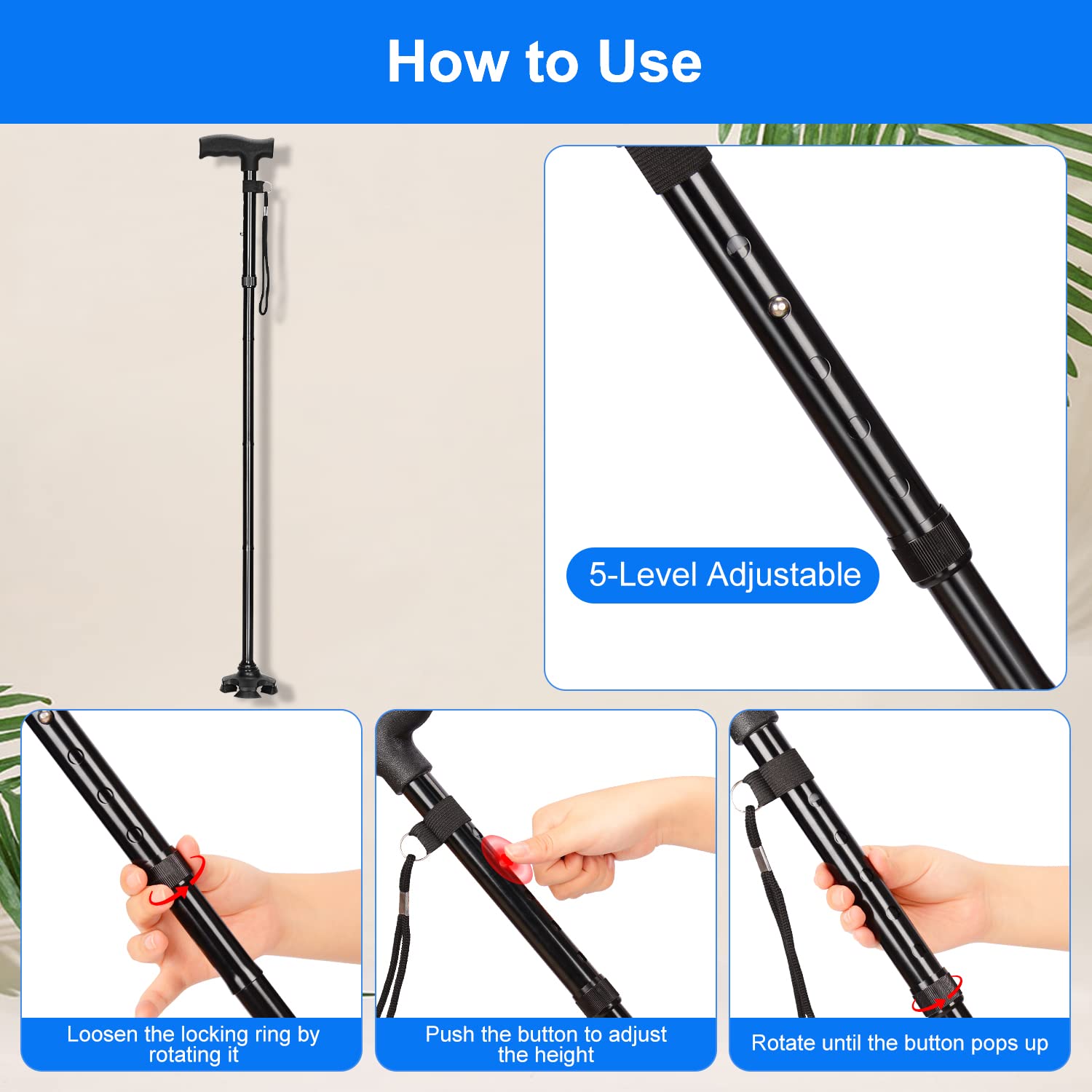 I recently ordered a folding cane with T-handle and anti-lost wrist strap for my father and I'm very happy with it. The 5-level adjustable height feature is very useful as it allows my father to adjust the height to his liking. The T-Handle provides a comfortable grip, making it easy for him to hold onto the cane for extended periods of time. The anti-lost wrist strap is also a great feature as it gives my father an added sense of security knowing that he won't accidentally drop the cane. Additionally, the non-slip, self-standing, 4-legged rubber support provides excellent stability on various types of surfaces, giving my father more confidence when using the cane. Another great feature is the collapsible design, which makes it easy to store and transport when not in use. Overall, this cane has been a great help to my father and I recommend it to anyone who is in need of a reliable and versatile folding cane.