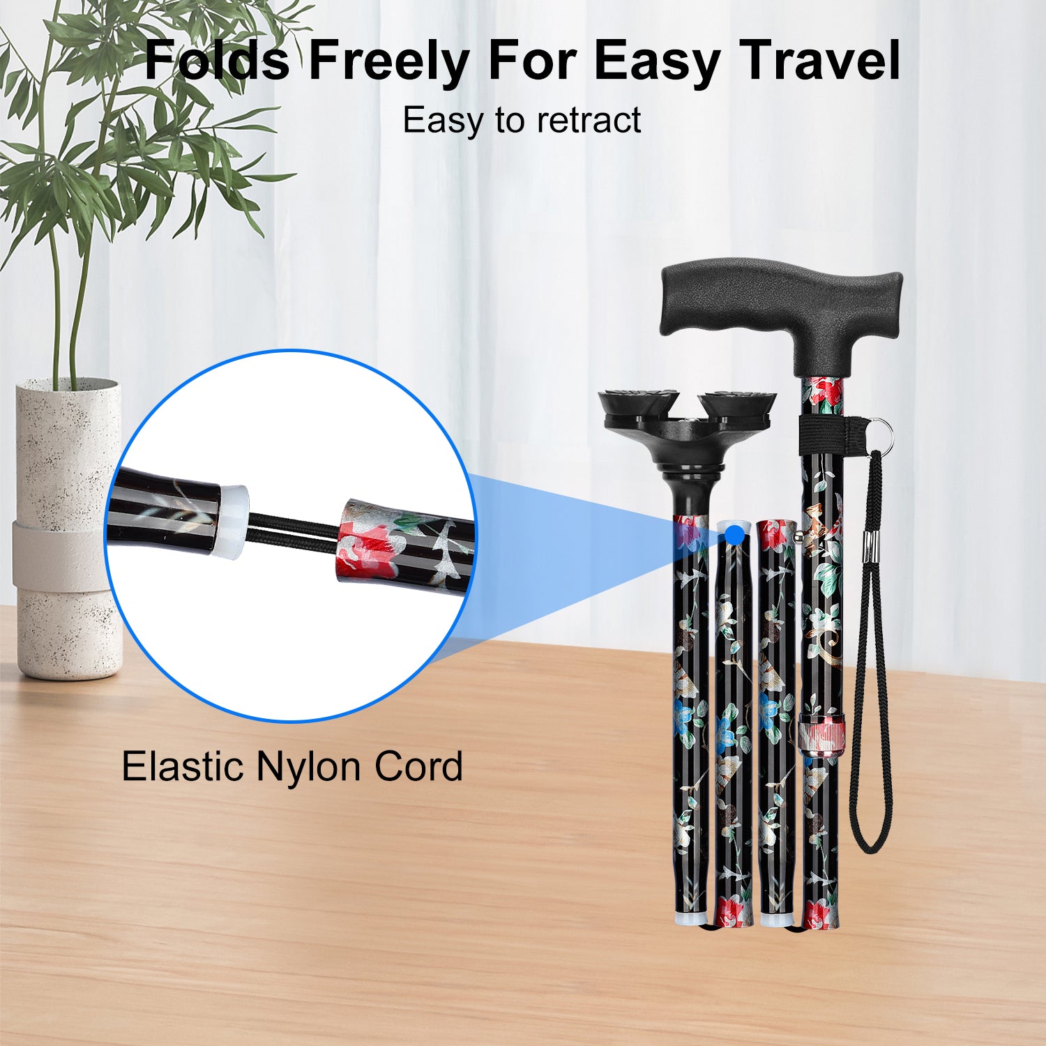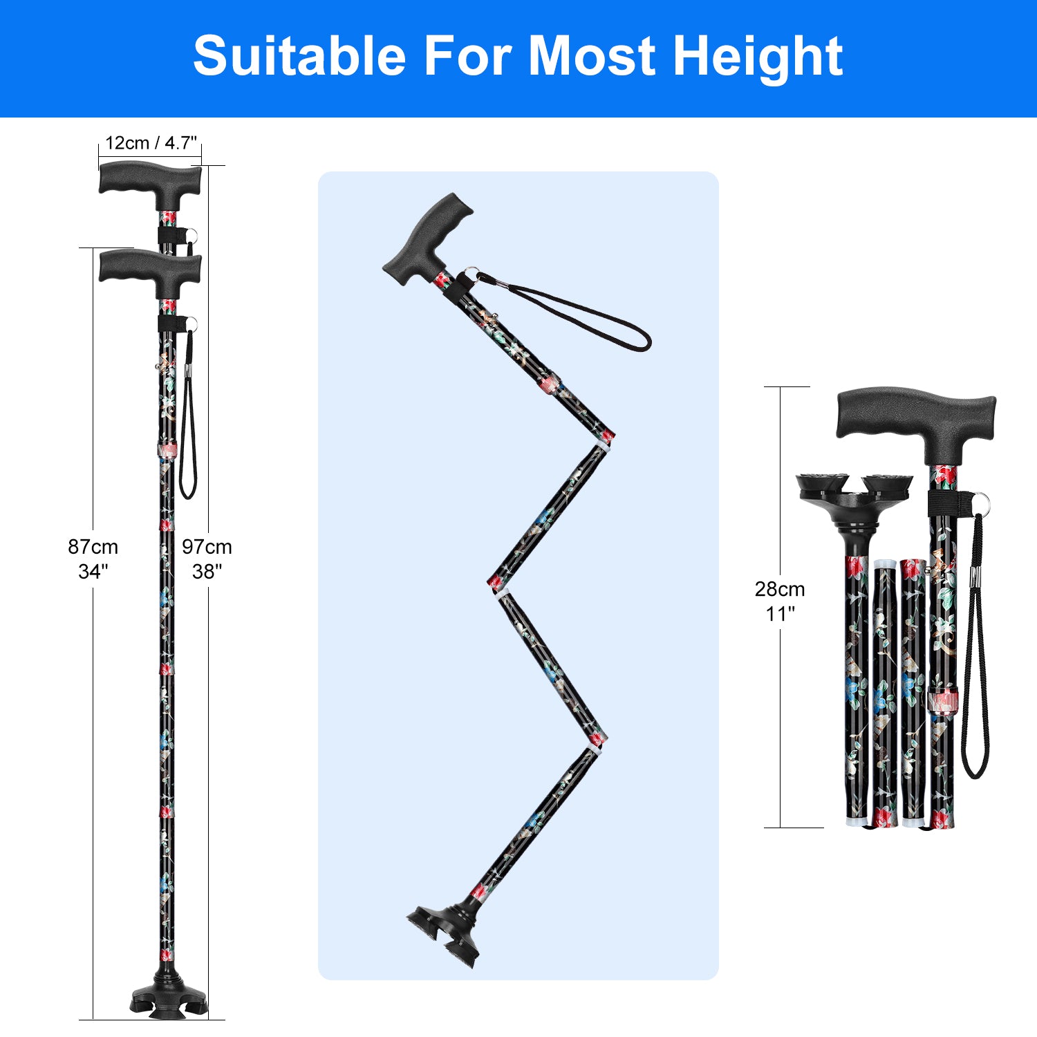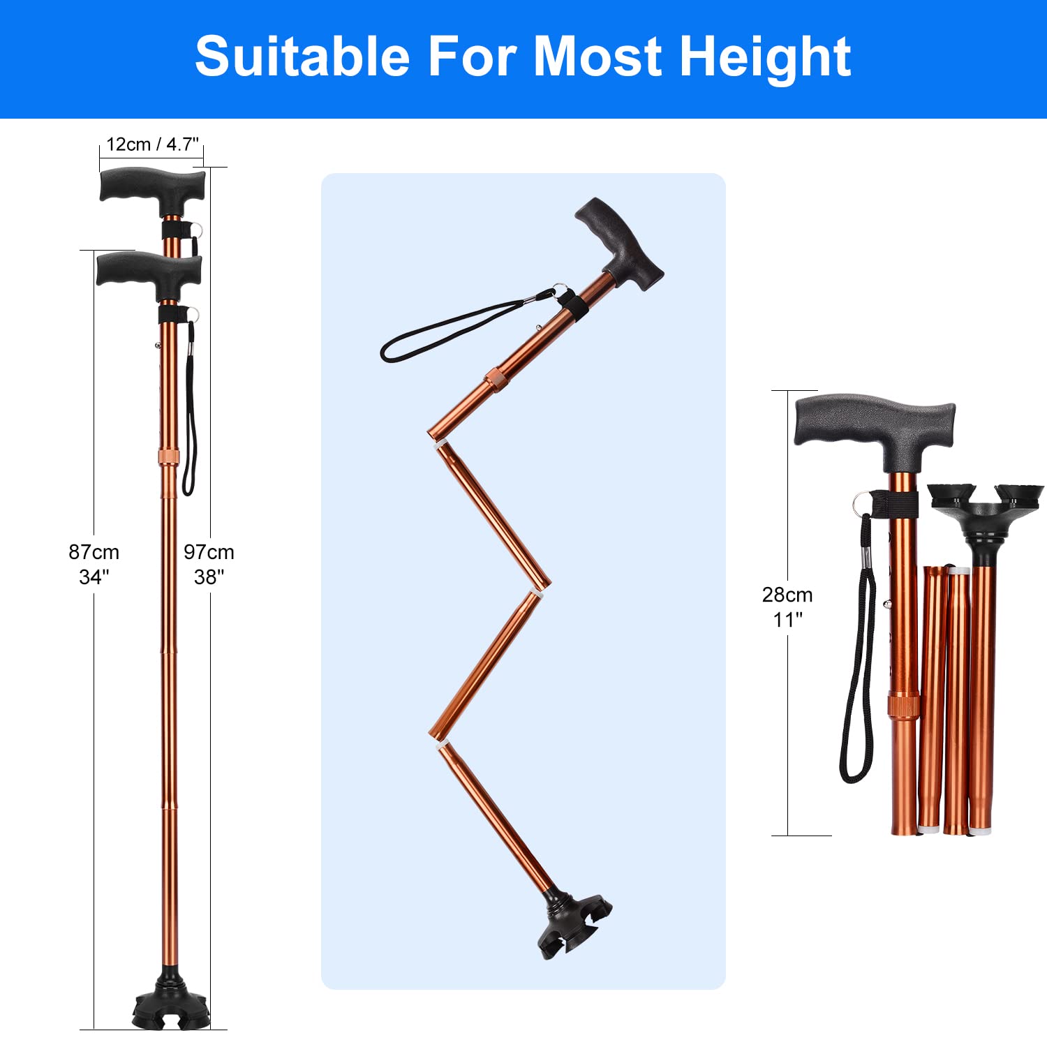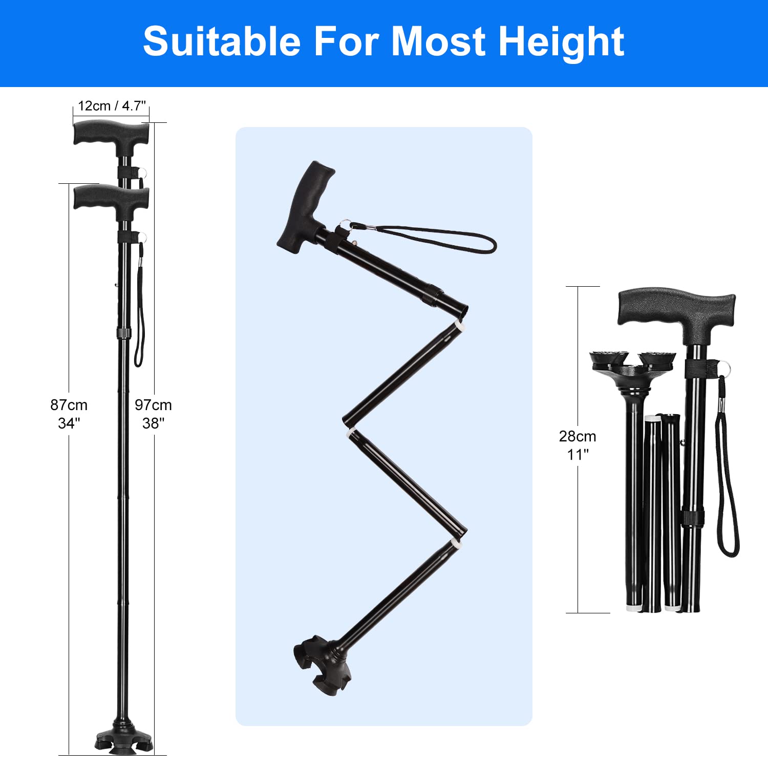 - Foldable Design: can be effortlessly folded into 4 sections with a 11 inch length for compact storage and traveling whenever needed, and can be easily flipped back for continuous and safe use