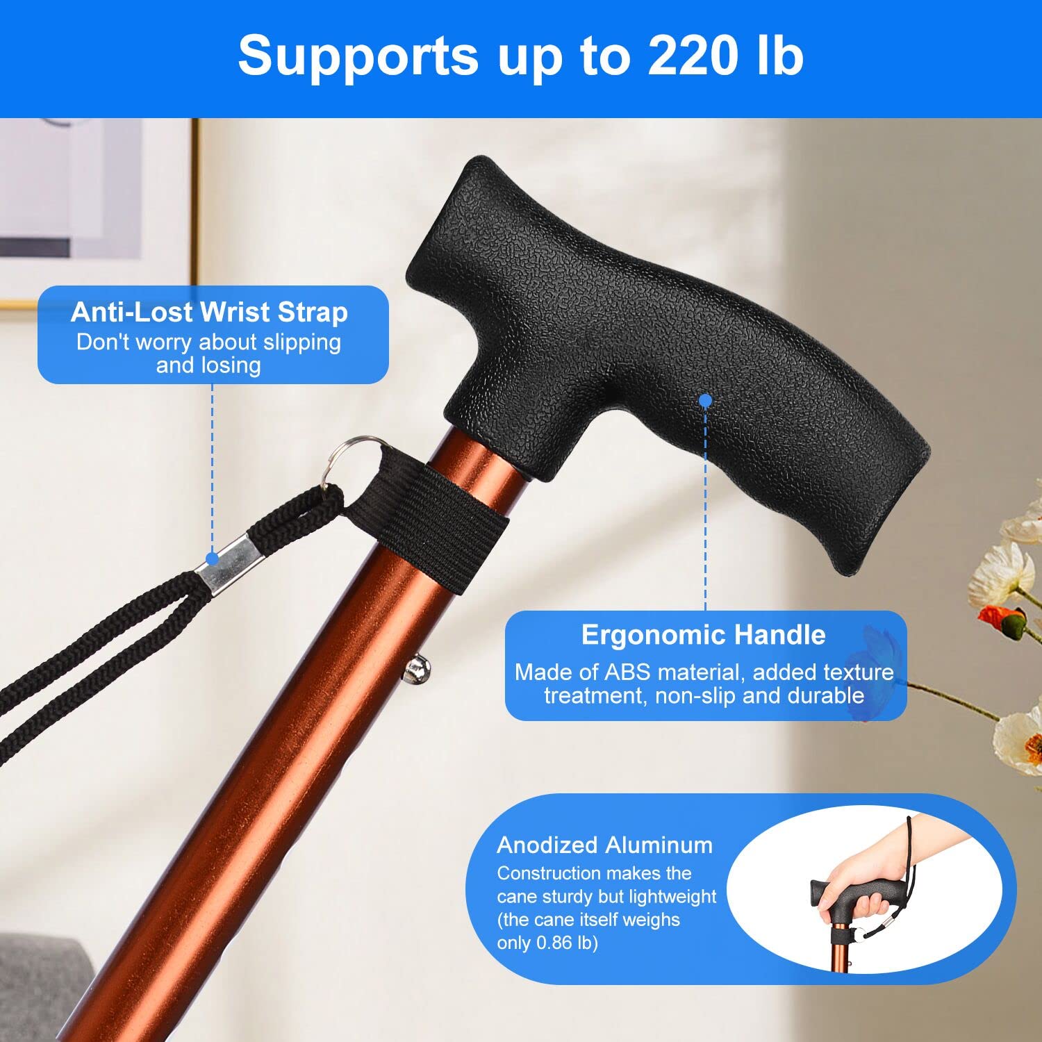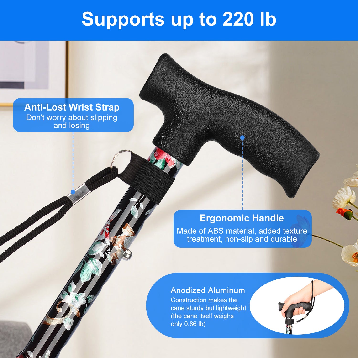 - Security Support: anodized aluminum construction makes the cane sturdy but lightweight for easy carrying and use; with a maximum support capacity of 220 lbs, the cane provides optimal comfort and support in your daily routine