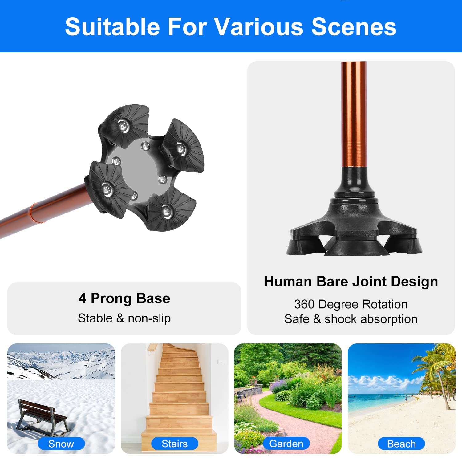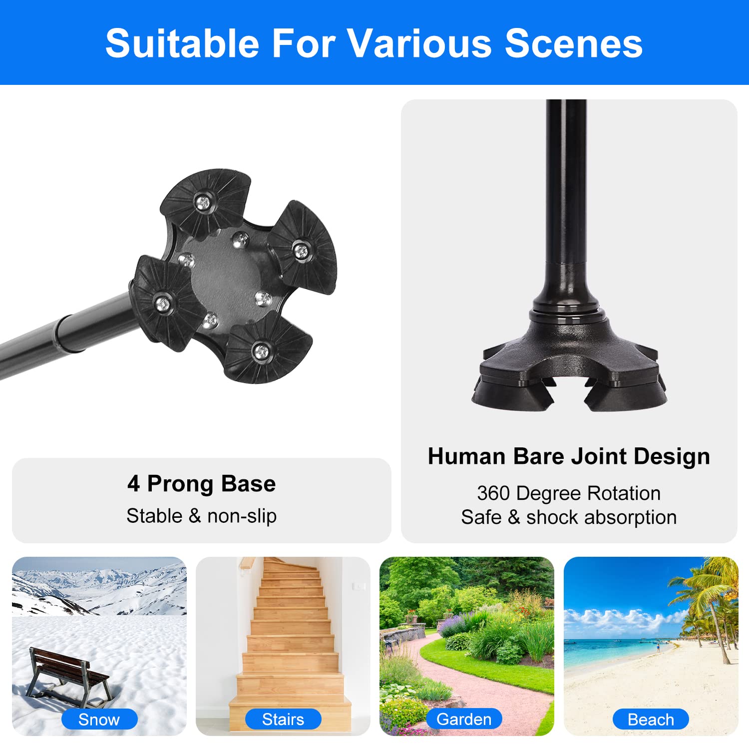 - Shock-Absorbing Swivel Base: mimicked human body design provides unrestricted mobility and secure shock absorption; spacious base on four sides and non-slippery rubber feet allows self-standing, providing extra balance and stability on almost any surface; ideal for elderly, disabled, injured, men or women, indoor or outdoor