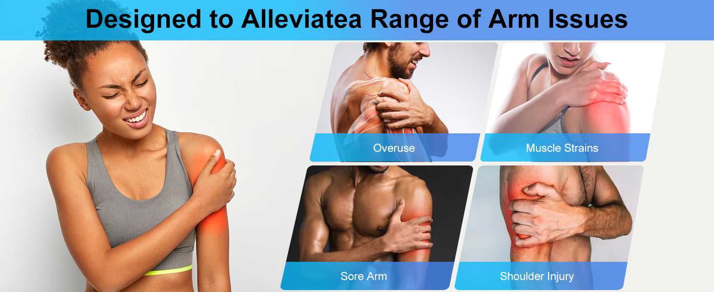 - Targeted Support for Arm Muscles: specifically designed to alleviate a range of arm issues, including tendinitis, synovitis, osteoarthritis, muscle strains, and tears; works by absorbing vibrations, thereby raising muscle temperature and improving blood circulation, which significantly reduces recovery time