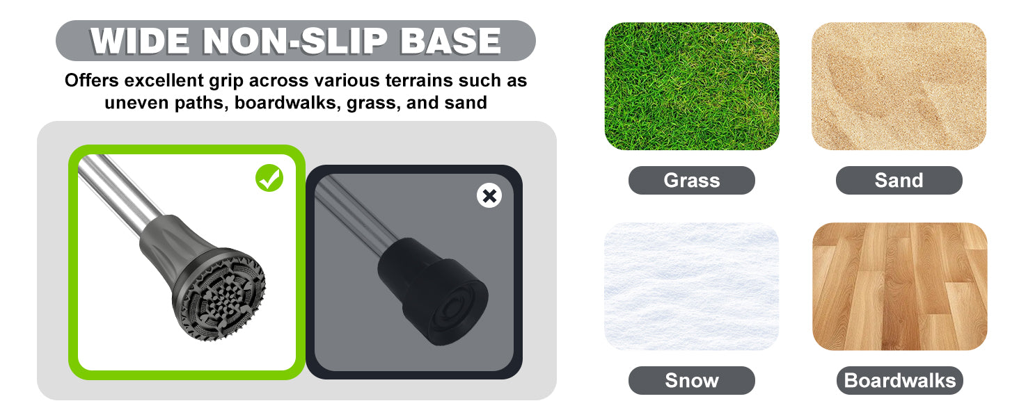 - Enhanced Safety: the specially designed non-slip base ensures extra safety when walking on uneven surfaces such as bumpy paths, boardwalks, grass, gravel, mud or even beaches; the no-water-trap replacement tip provides users with added confidence