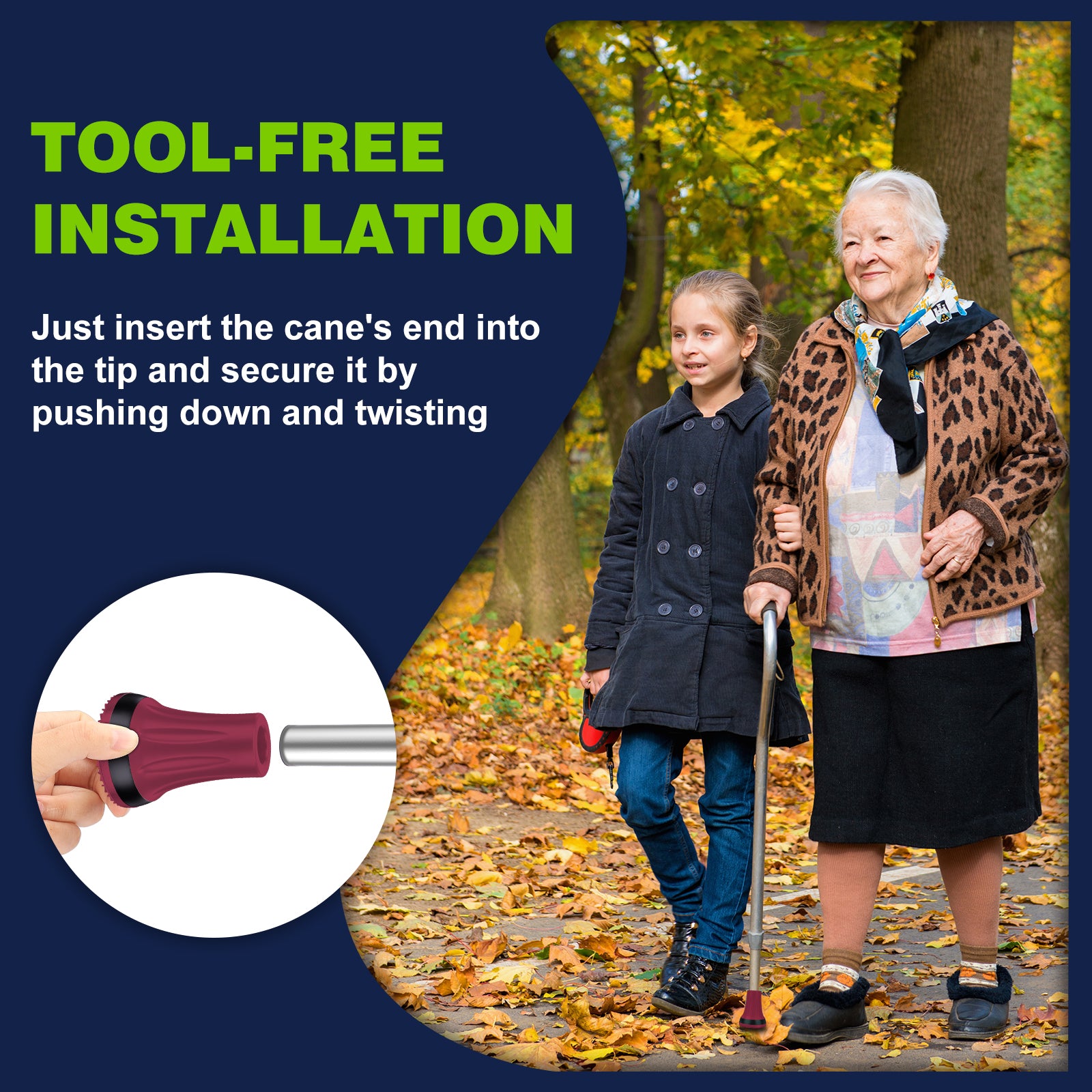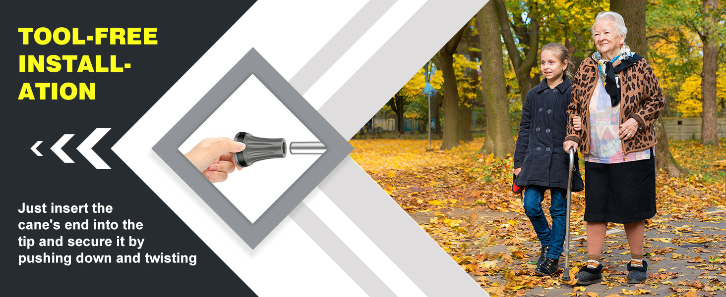 - Tool-Free Easy Installation: to install, simply remove the old tip from your existing mobility aid device, then insert the shaft into your new SupreGear cane base; with the help of a solid surface, such as a wall or the ground, users can easily push and twist downward to complete the installation