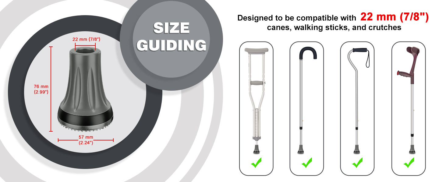 - Replacement Crutch Feet Cap: this package includes 2 crutch tips 7/8 inch; the SupreGear unique cane tips are designed to fit all 7/8" crutches, walking sticks, and canes, offering users improved balance, enhanced stability, and better ground contact