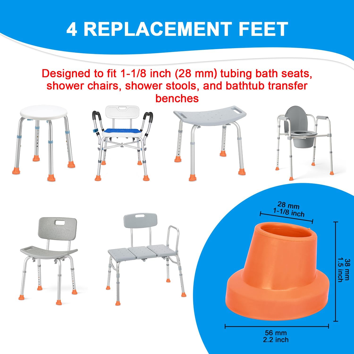 - Universal Fit 1-1/8 inch: The non-slip suction cup feet cap fits most bath benches, shower chairs, tub seats, and transfer benches with 1-1/8 inch tubing; be sure to measure the size of your chair legs before ordering to ensure a perfect fit