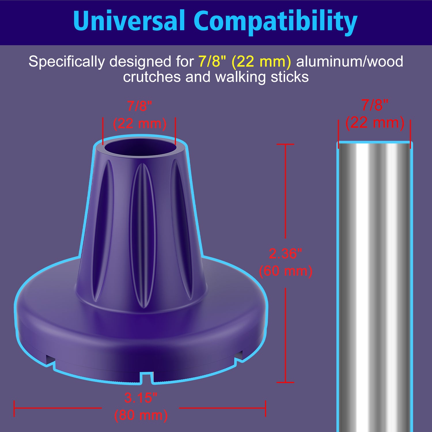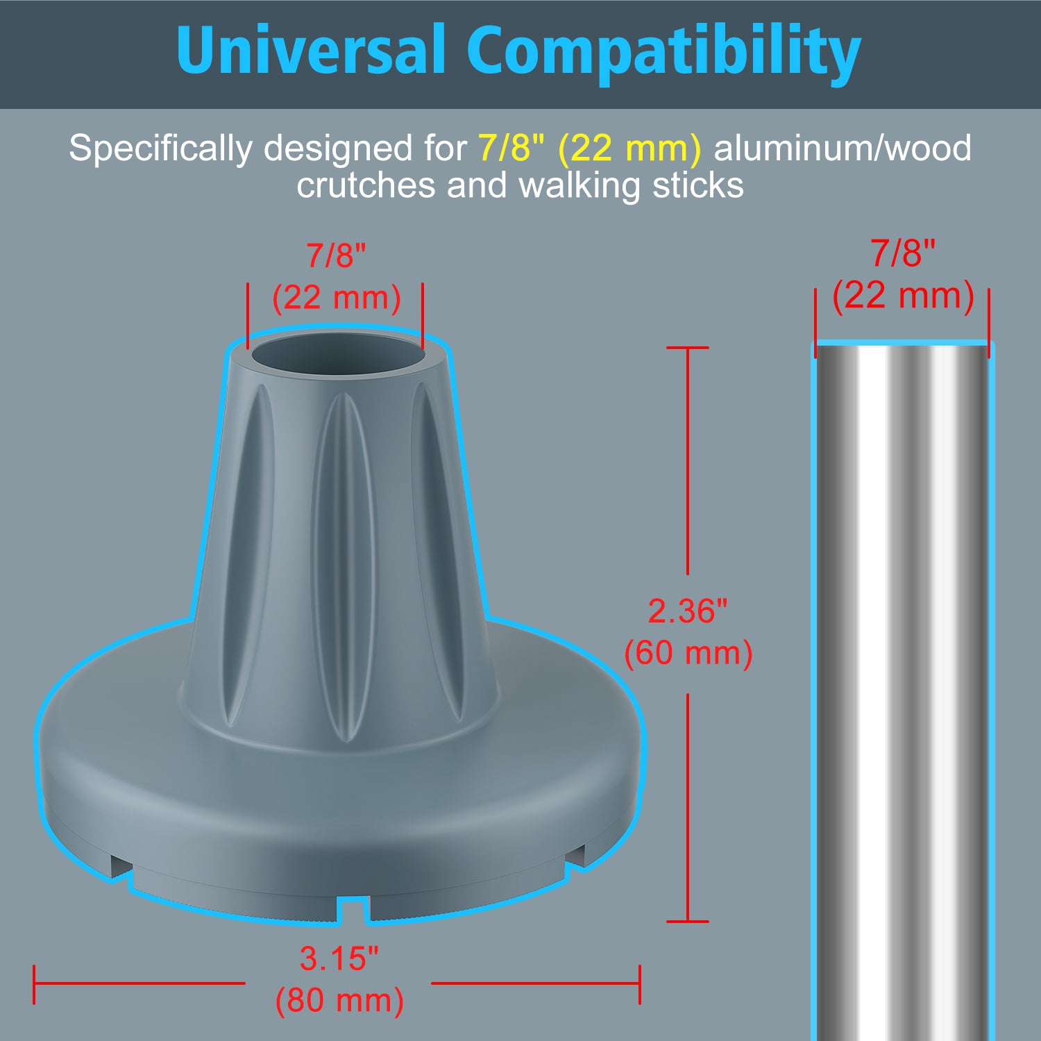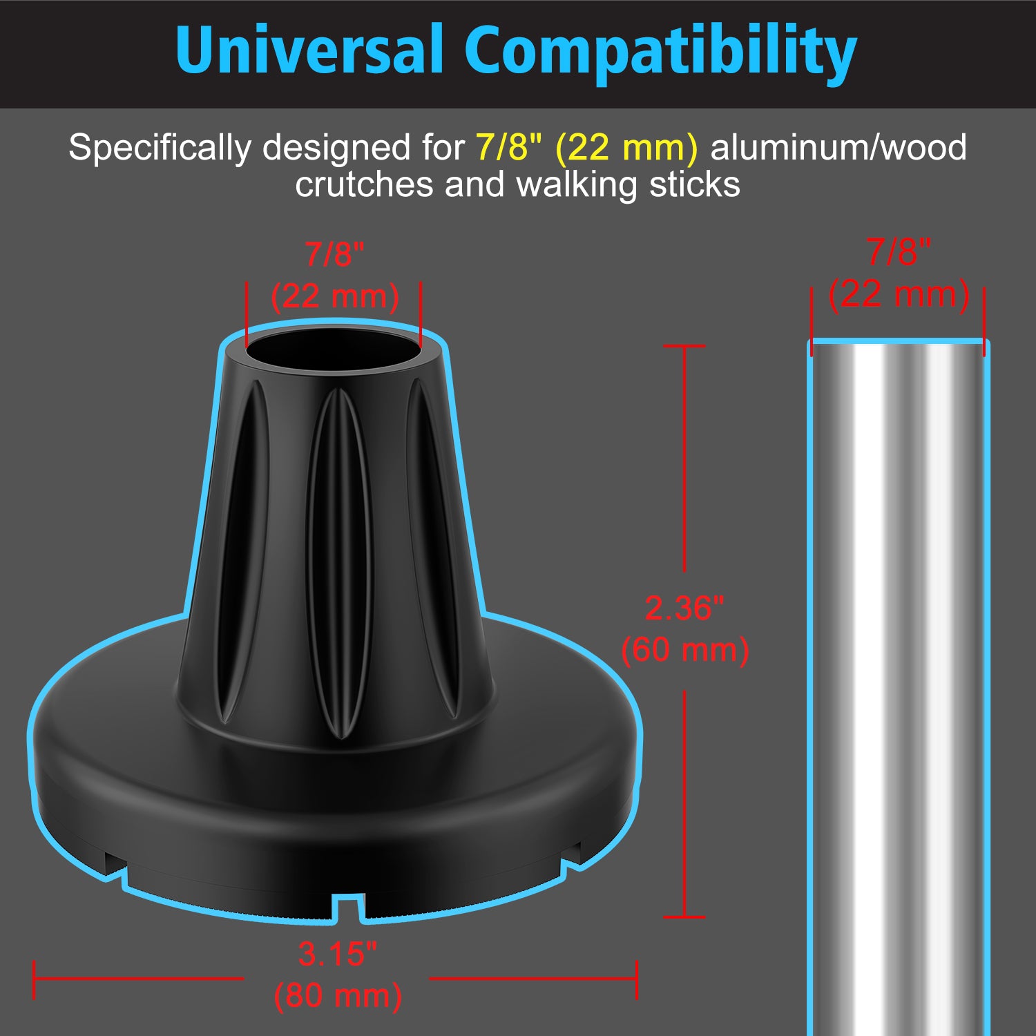 - Universal Compatibility: Specifically designed for 7/8" (22 mm) aluminum/wood crutches and walking sticks, these crutch tips perform reliably on indoor floors and outdoor terrain including grass, gravel, and sand