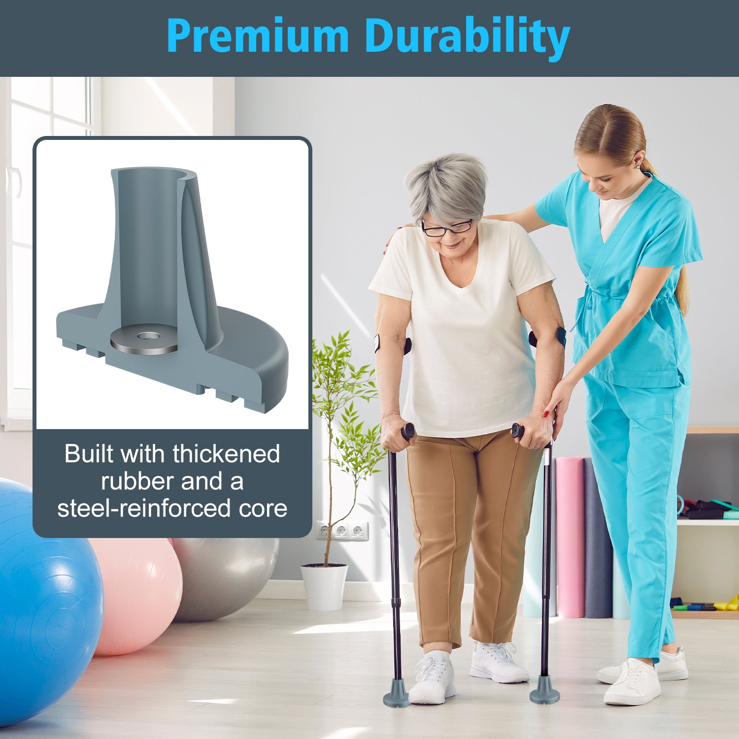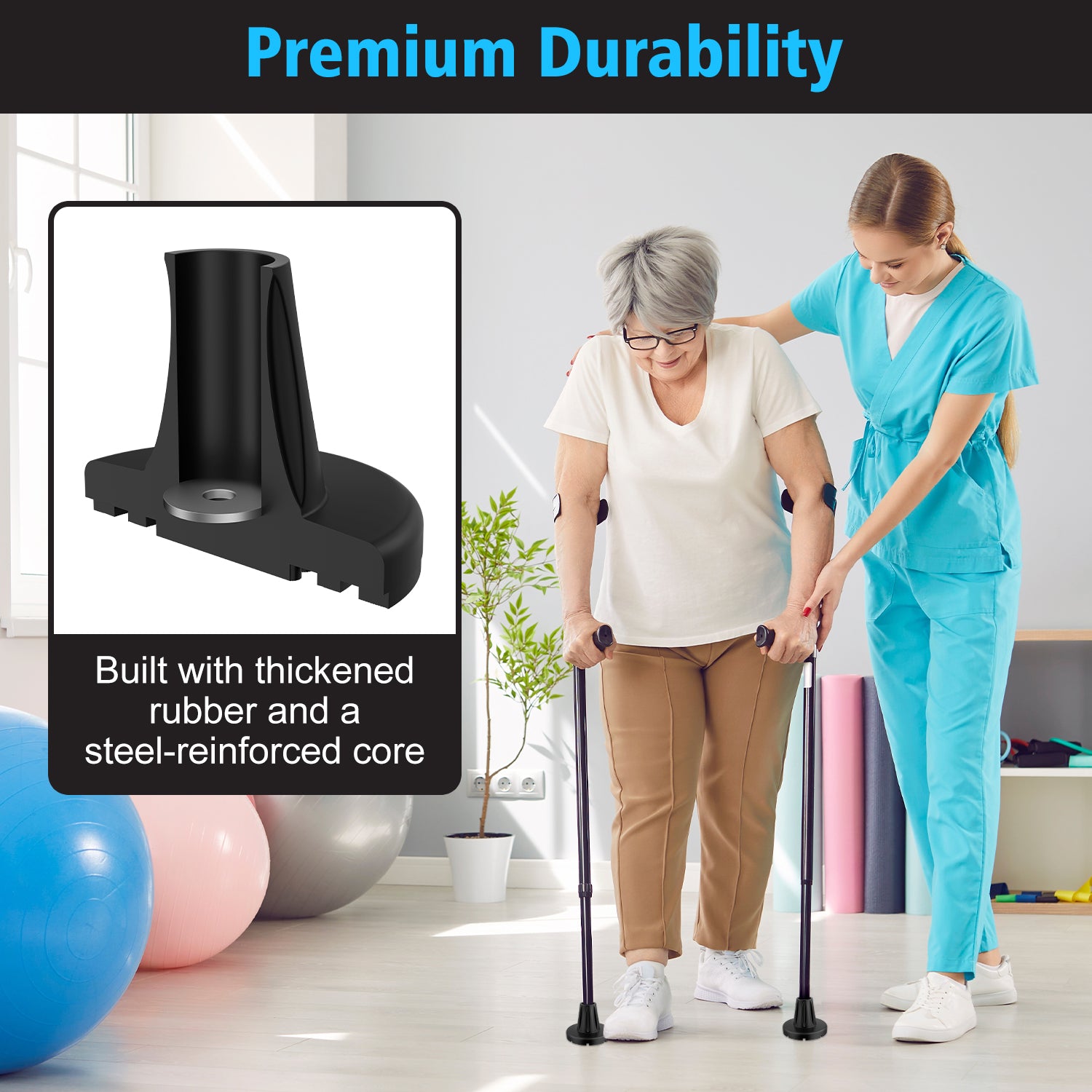 - Premium Durability: Built with thickened rubber and a steel-reinforced core, the heavy-duty crutch foot pad resists cracking and abrasion while delivering extended durability over standard tips