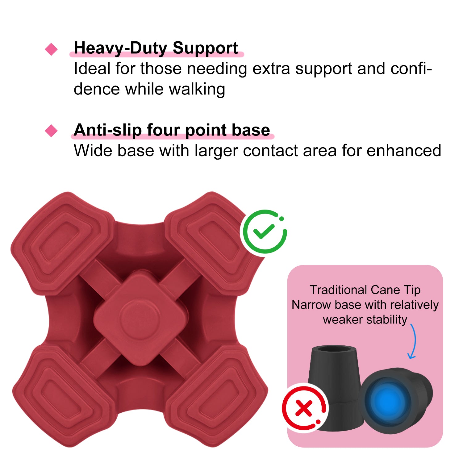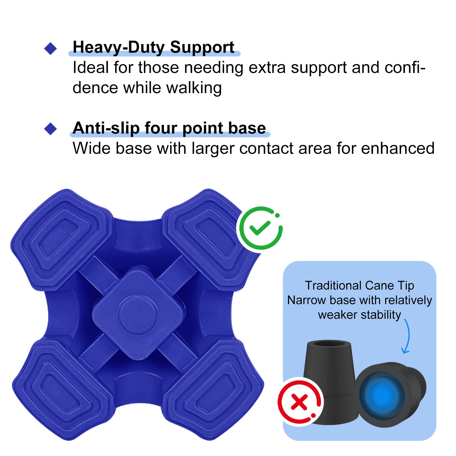 - Heavy-Duty Support: fits for both standard and folding 3/4" (19 mm) canes, this heavy-duty quad tip offers four-point floor contact for superior balance—ideal for those needing extra support and confidence while walking