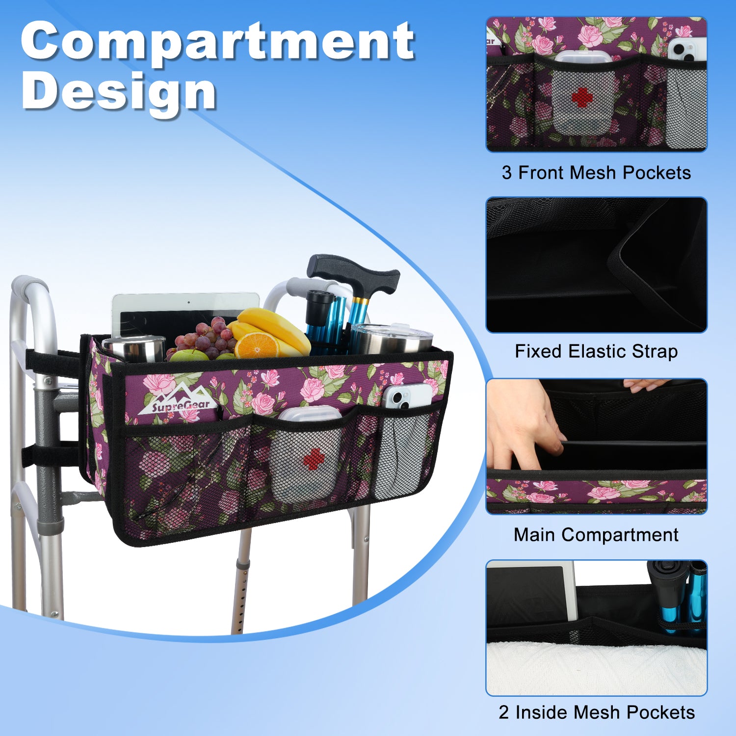 - Large Capacity Pouch for Folding Walker: Featuring multiple pockets and a roomy main compartment, it provides easy access to your daily essentials, such as water bottles, umbrellas, pill cases, cell phones, notebooks