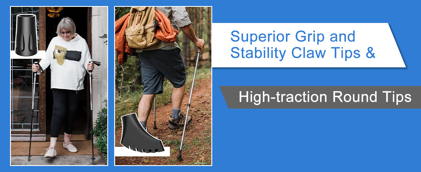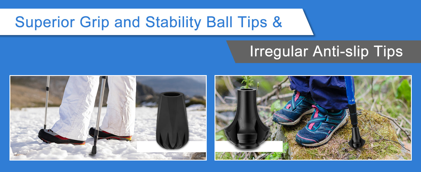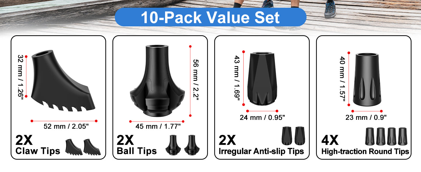 - 10-Pack Value Set: Includes 2 claw tips, 2 ball tips, 4 high-traction round tips, and 2 irregular anti-slip tips; ideal for walking, hiking, trekking, and daily use across various terrains