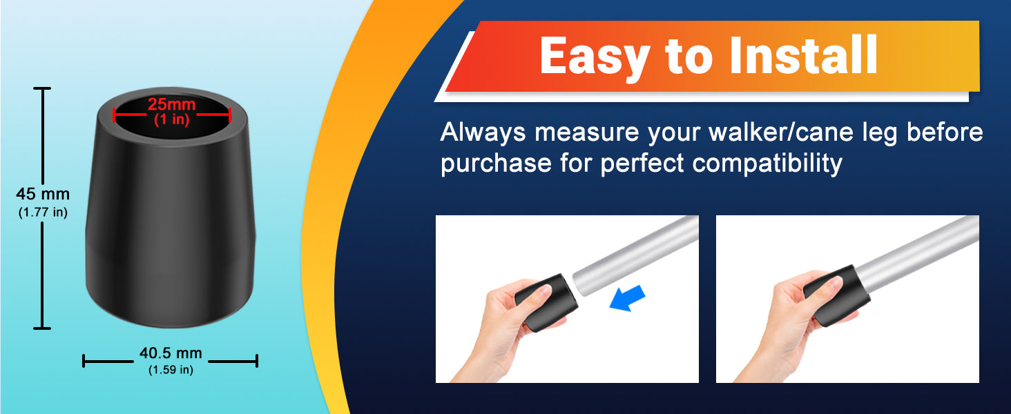 - Universal Fit for Walkers and Walking sticks: Fits 1 inch (25 mm) outer diameter tubes; always measure your walker/cane leg before purchase for perfect compatibility