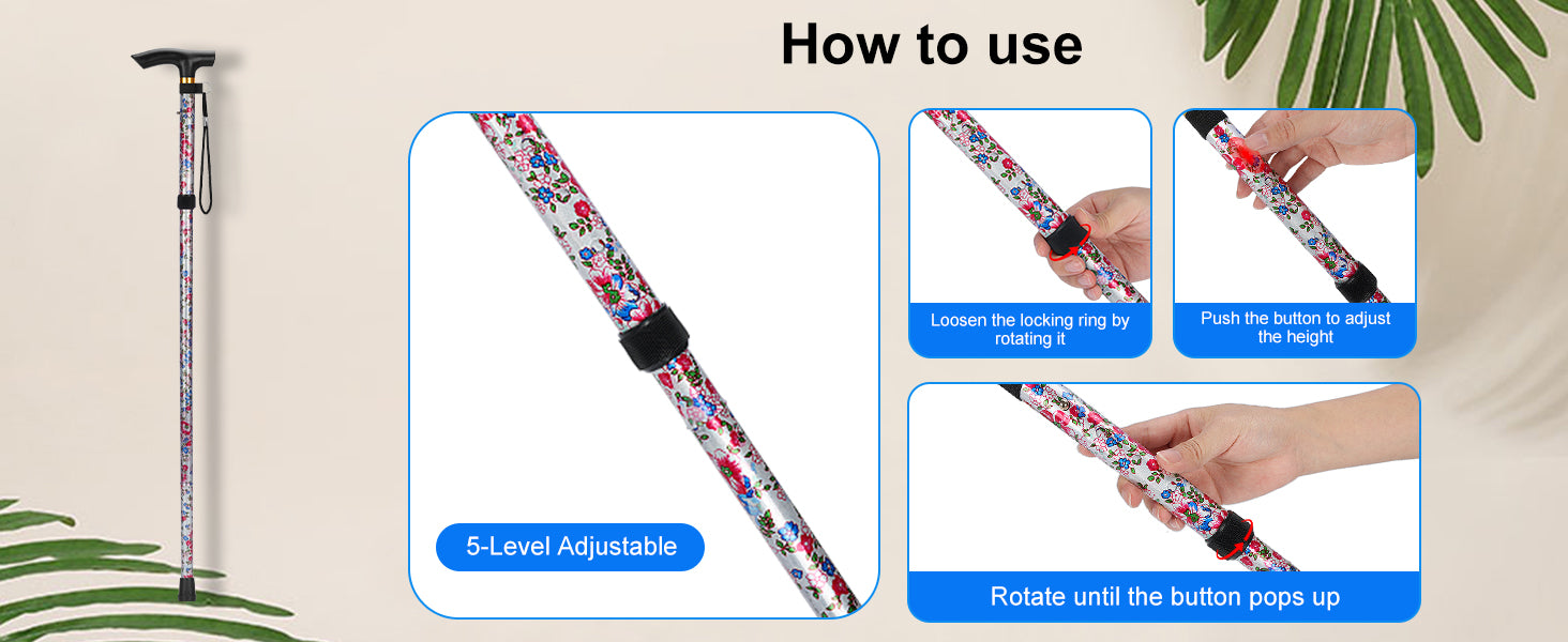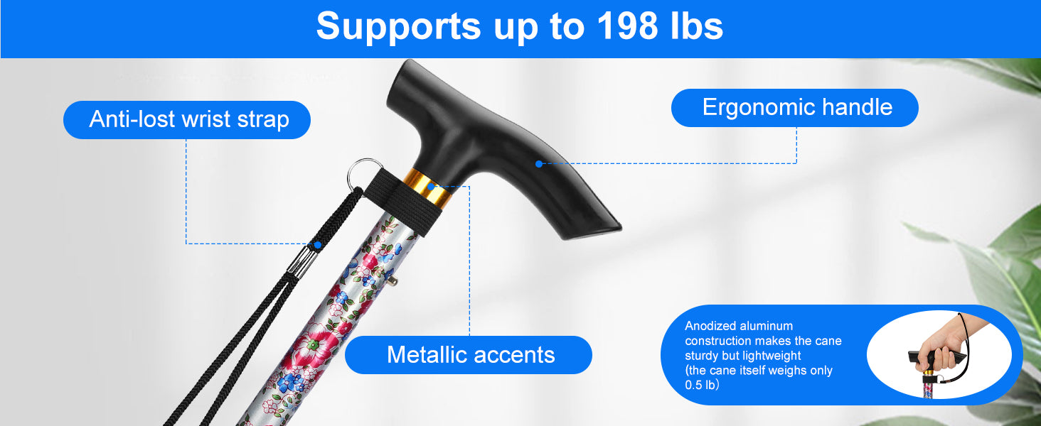 - Lightweight and Durable Construction: Crafted from sturdy aluminum, this folding cane supports up to 250 pounds (113 kg); the 1 mm/0.04 inch thick tube ensures long-lasting durability while remaining lightweight and easy to carry; its stylish floral pattern adds a personal touch to this practical mobility aid