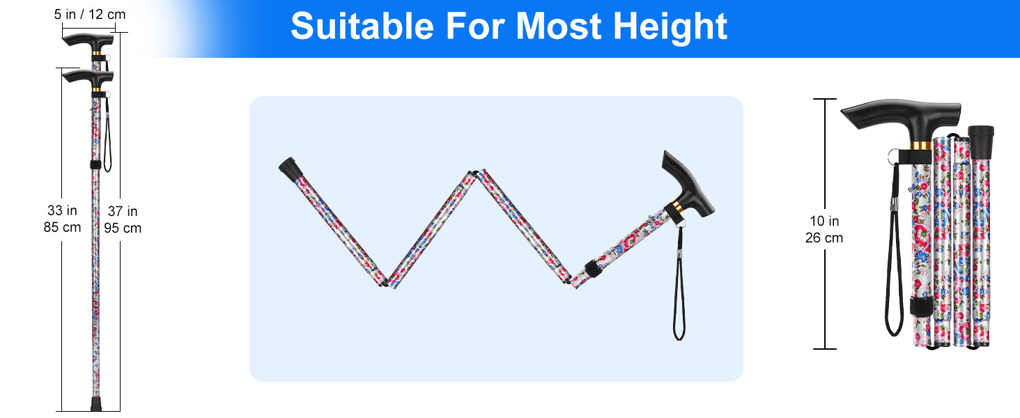 - Adjustable Height for Personalized Comfort: Featuring 5 adjustable height levels in 1-inch (33 to 37 in) increments/2.5 cm (85 cm to 95 cm) increments and suitable for users with a height range of 5-6.5 in (152-195 cm), this walking stick is ideal for seniors, the disabled; it provides optimal support and balance, making it suitable for both indoor and outdoor use, and can be customized to individual height preferences for maximum comfort