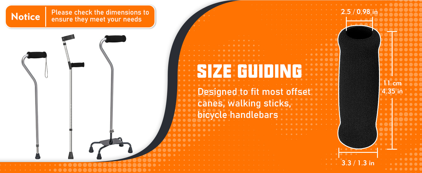 - Universal Fit: Each replacement handle measures 4.35 x 1.3 x 1.3 inches (external) and 4.35 x 0.98 x 0.98 inches (internal); designed to fit most offset canes, walking sticks, bicycle handlebars, tool handles, and sports equipment, these grips provide versatility and convenience; please check the dimensions to ensure they meet your needs