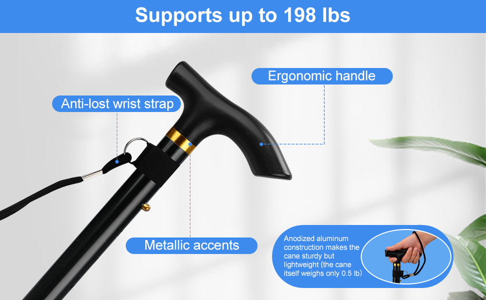 - Folding Cane ($19.99/unit):The cane supports up to 198 lbs and can be folded into four sections, with a minimum length of 10 inches. Adjust the cane height to your personal preference from 33 to 37 inches in five different settings.