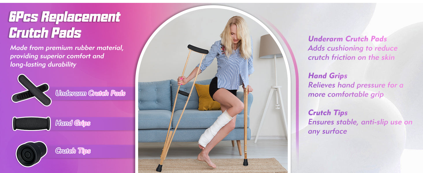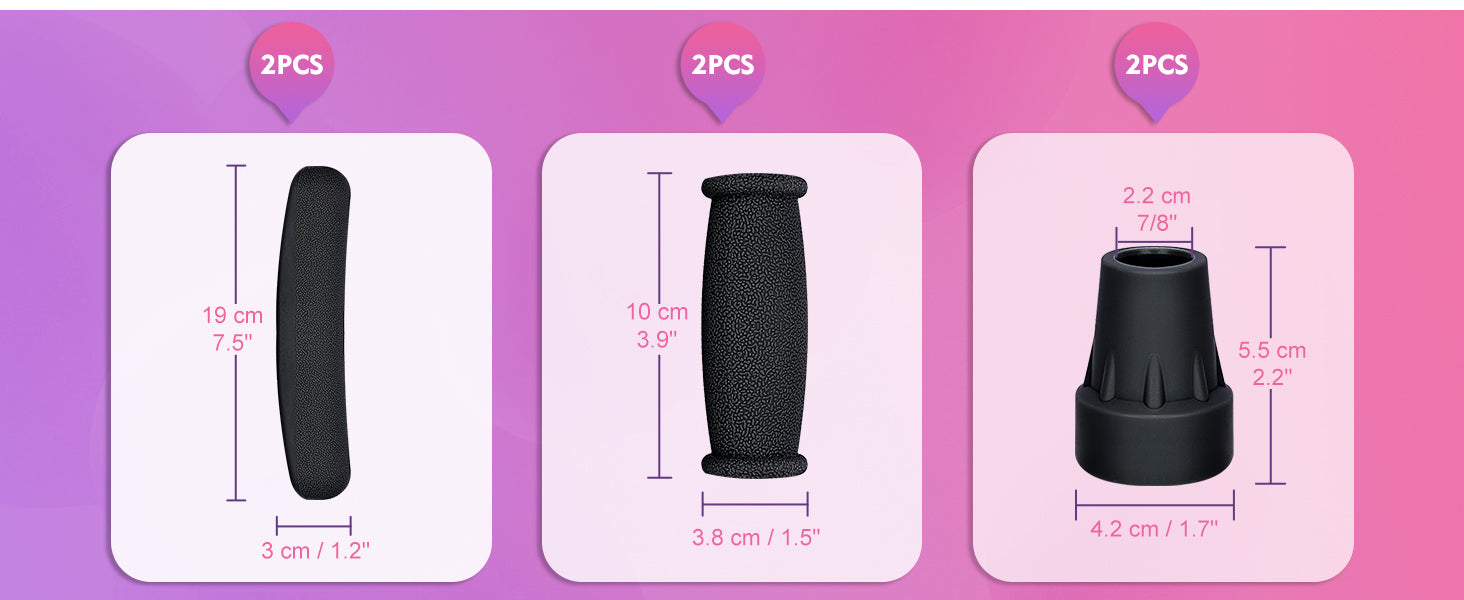- Complete Crutch Accessory Set: this package includes everything you need to enhance your crutch experience: two underarm pads, two hand grips, and two crutch tips; 1 month hassle free return and 1 year limited warranty