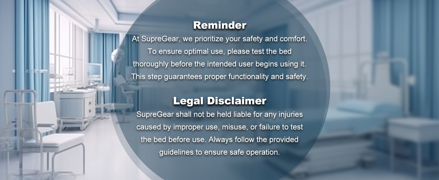 Legal Disclaimer: SupreGear shall not be held liable for any injuries caused by improper use, misuse, or failure to test the bed before use. Always follow the provided guidelines to ensure safe operation.
