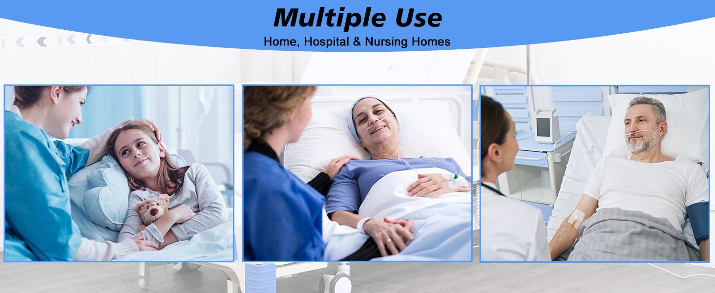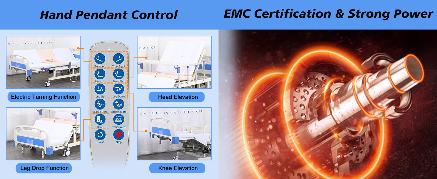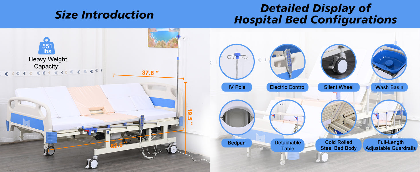 Easy Remote-Controlled Adjustments: The smart remote allows effortless bed positioning. Included accessories: stainless steel IV pole, wash basin, bedpan, and a removable table for convenience.