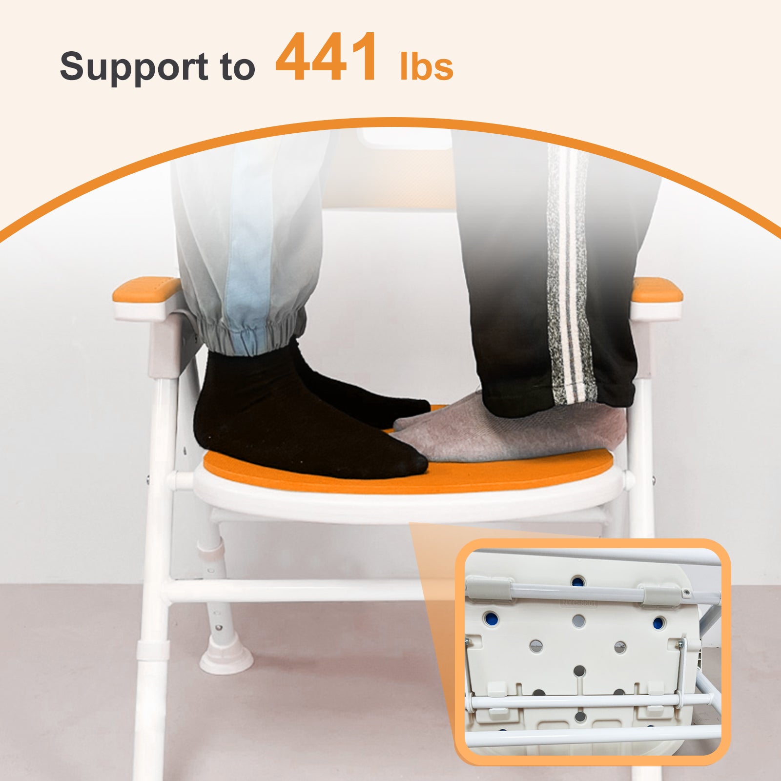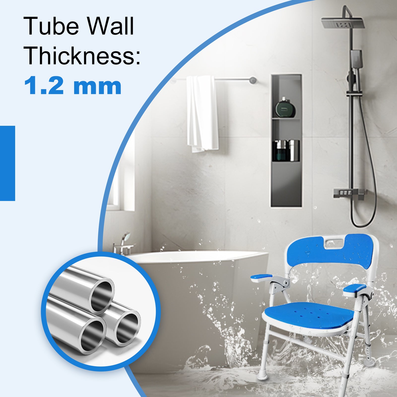 Sturdy & Durable: Constructed with reinforced aluminum alloy tubing (1.2 mm thick), this shower chair supports up to 275 lbs for excellent stability and reliability. The 304 stainless steel screws and premium piano baking paint finish not only give the chair a sleek, high-end appearance but also offer corrosion resistance, easy maintenance, and long-lasting durability.