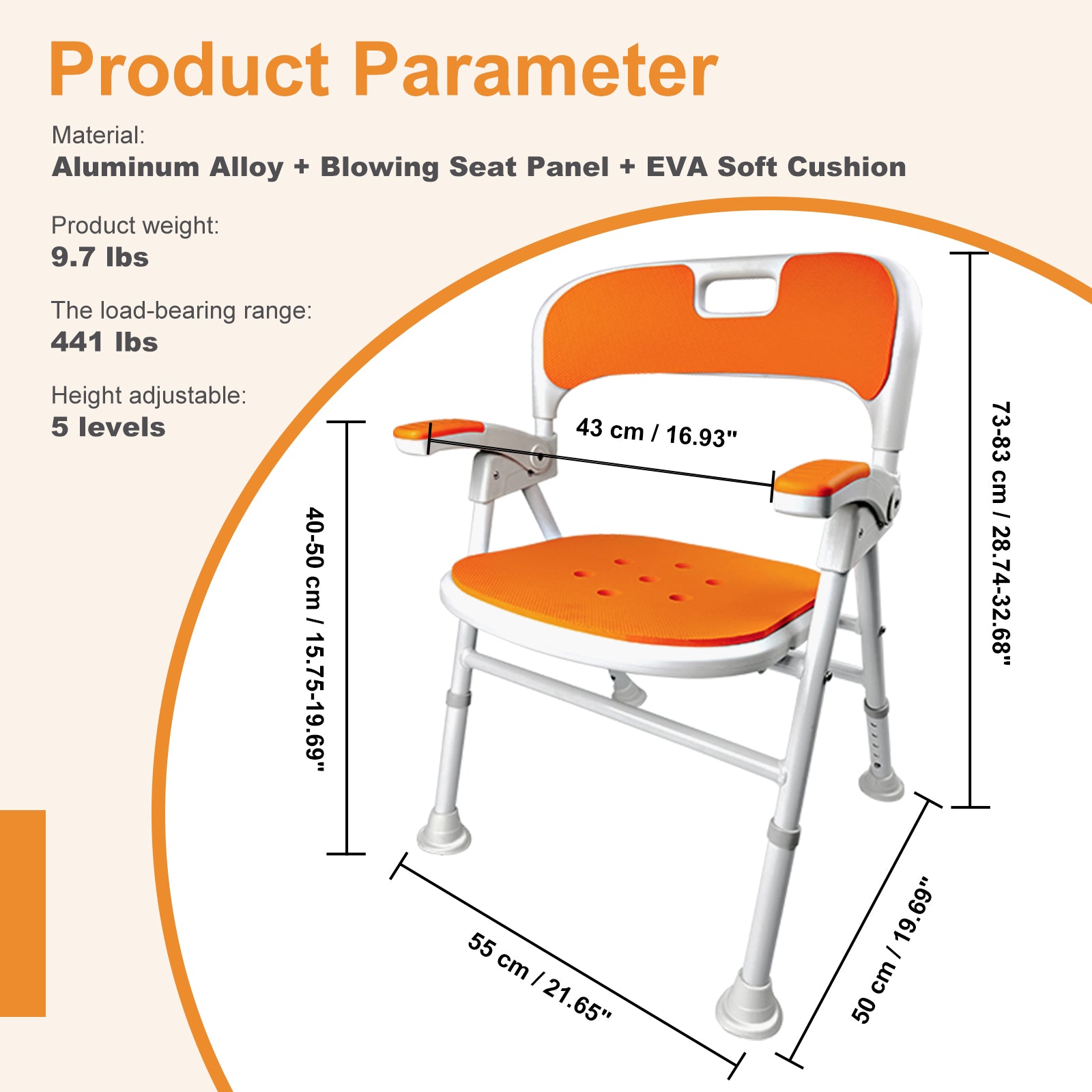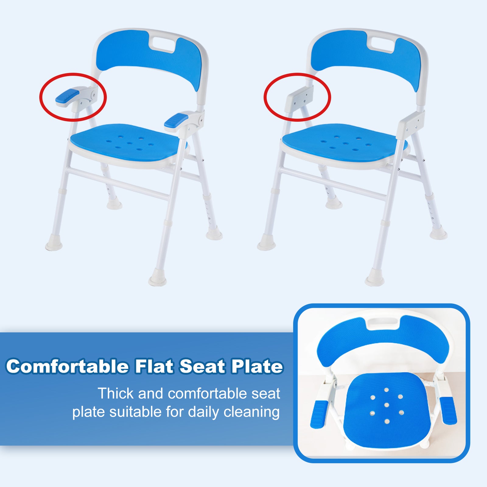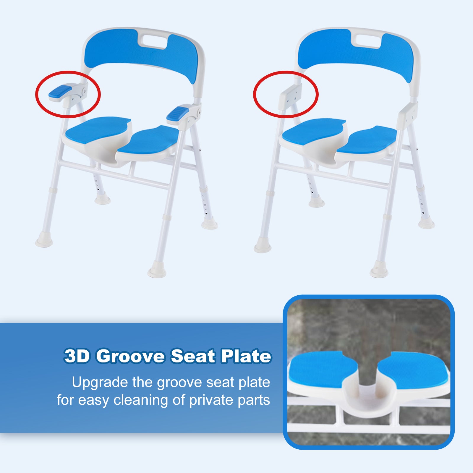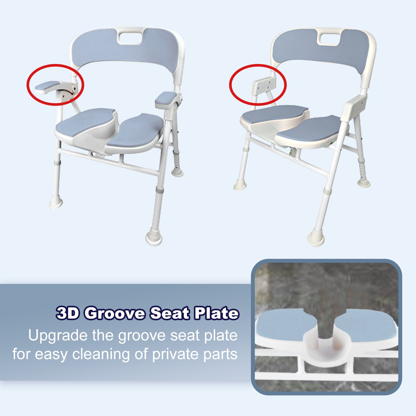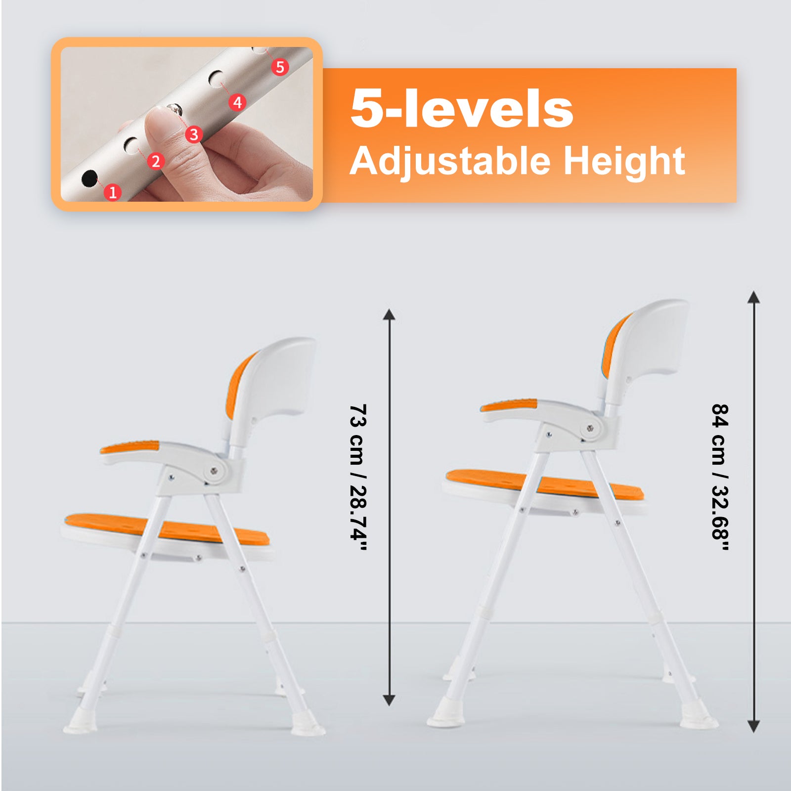 Comfort & Convenience: Featuring 5 adjustable height settings, the chair accommodates a range of users. It easily folds for compact storage and can stand independently when folded, saving space. The integrated nylon flip-up armrests provide additional support for sitting and standing, while making multi-angle cleaning more convenient. The one-piece molded design ensures durability and comfort.