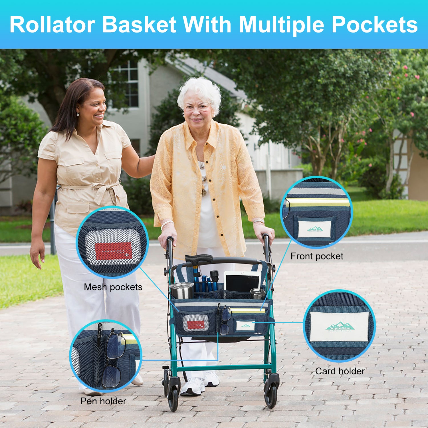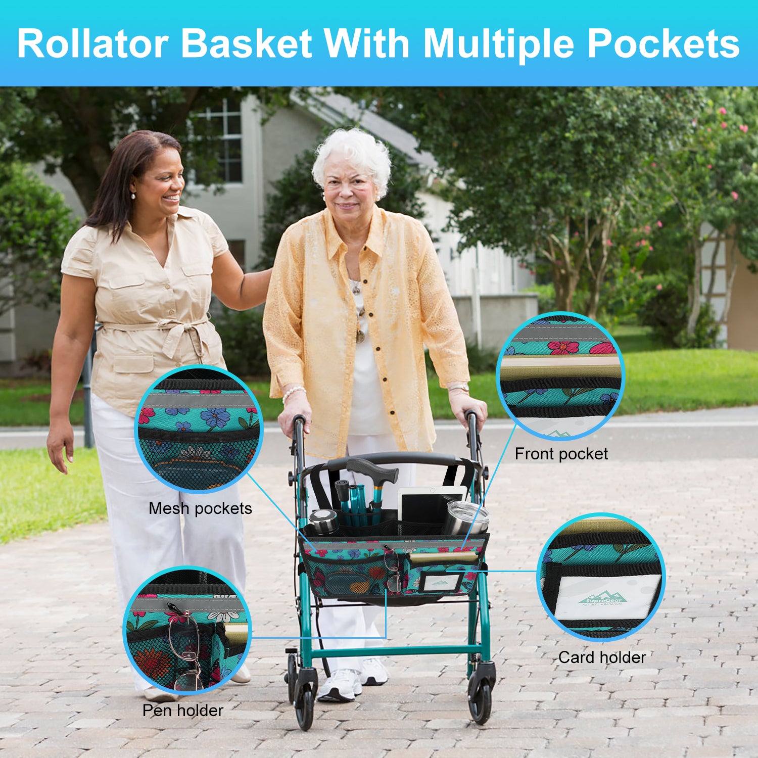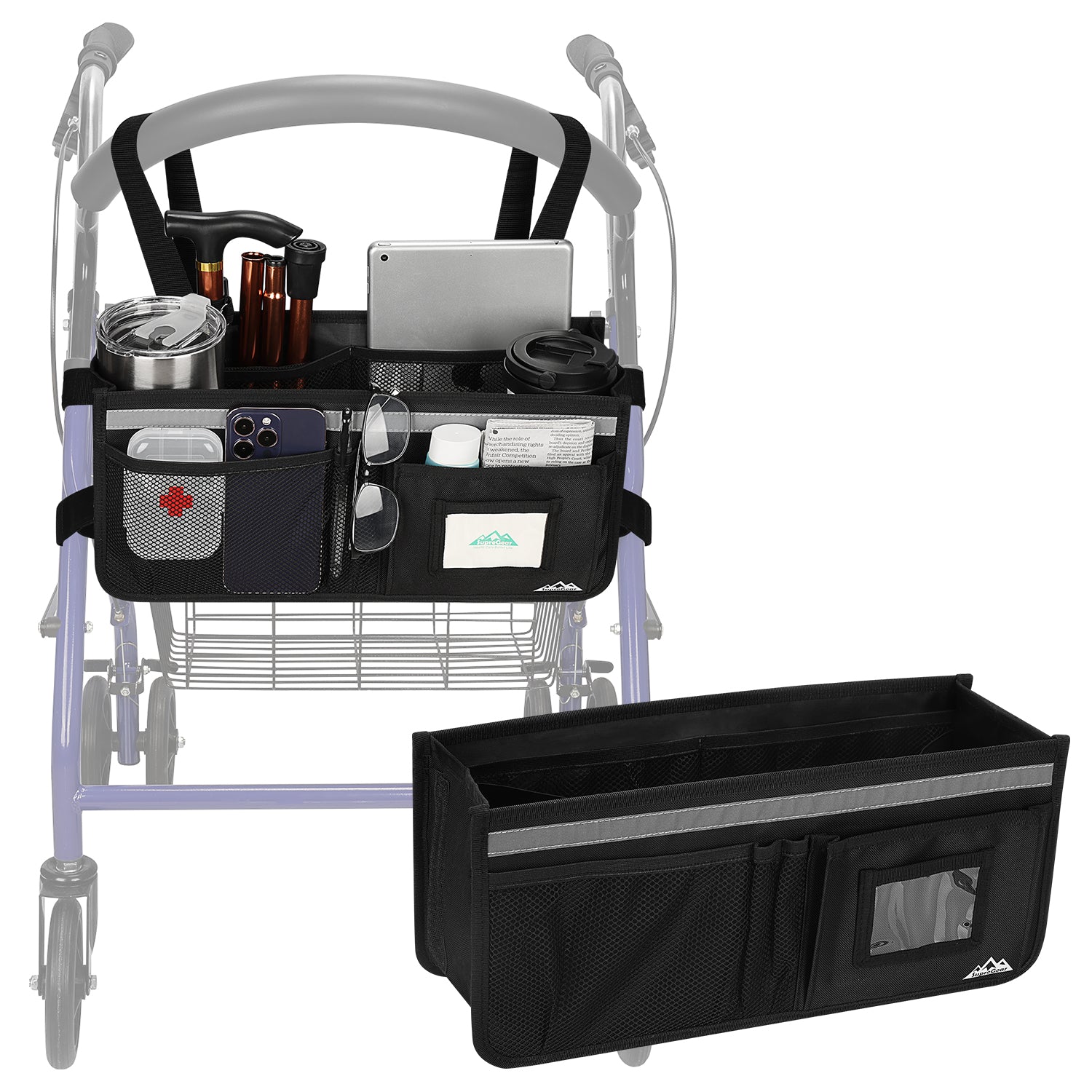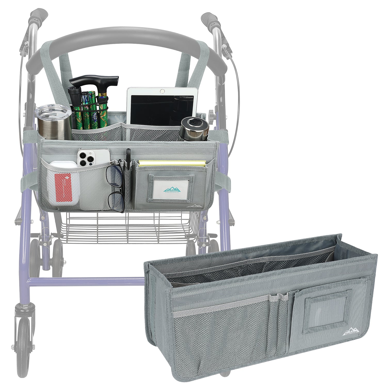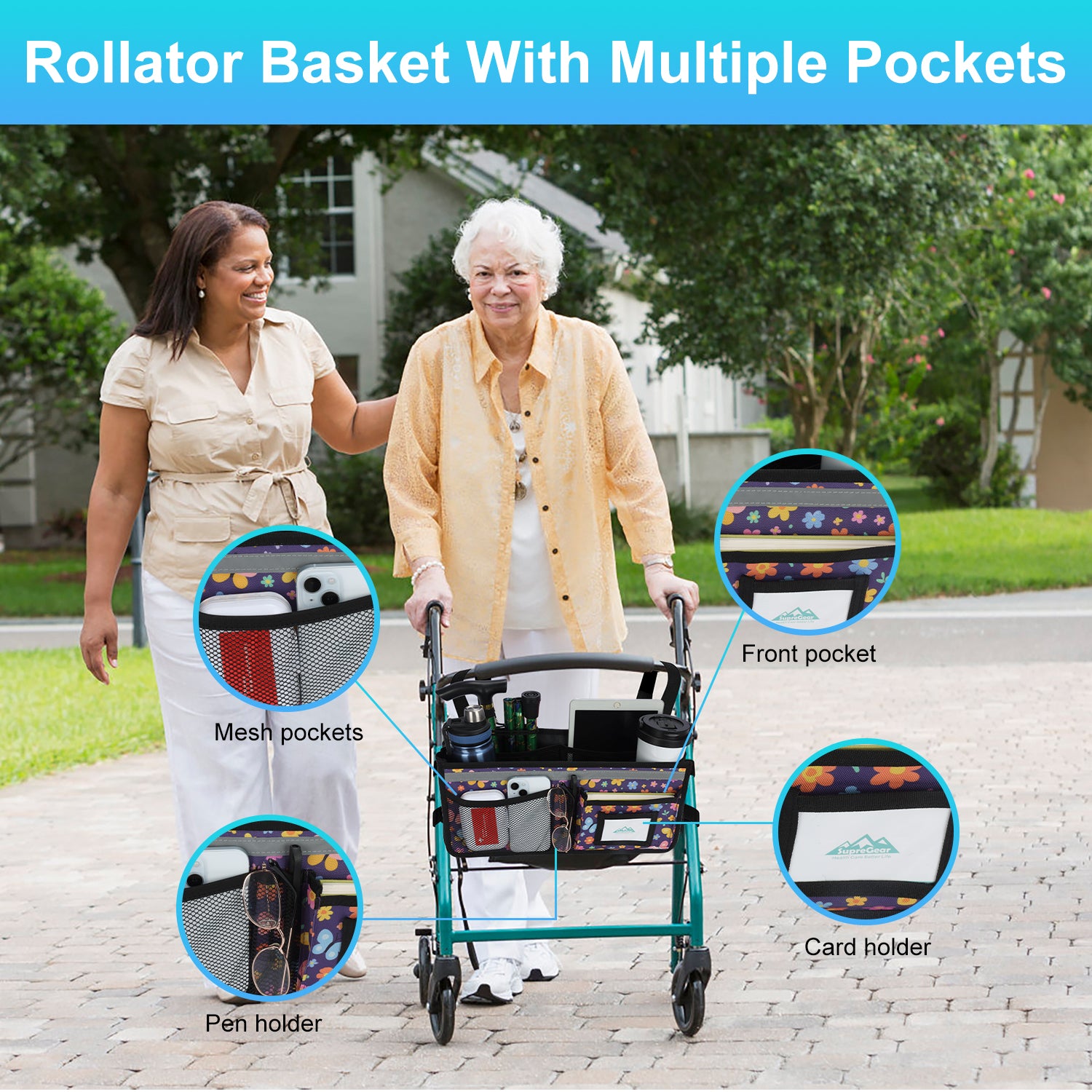 - The SupreGear basket for rolling walkers has ample storage space with its 3 insulated mesh pockets, 1 roomy pocket featuring a card holder, 2 pen pockets, and a large inner pocket for quick and easy storage of your phone, glasses, snacks, wallet, books, clothes, and other important items; equipped with 2 elastic bands to secure your water cup or bottles and prevent them from turning over, making it a versatile and practical solution for carrying all of your essentials