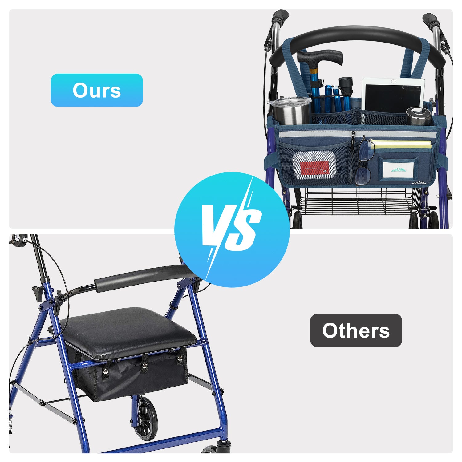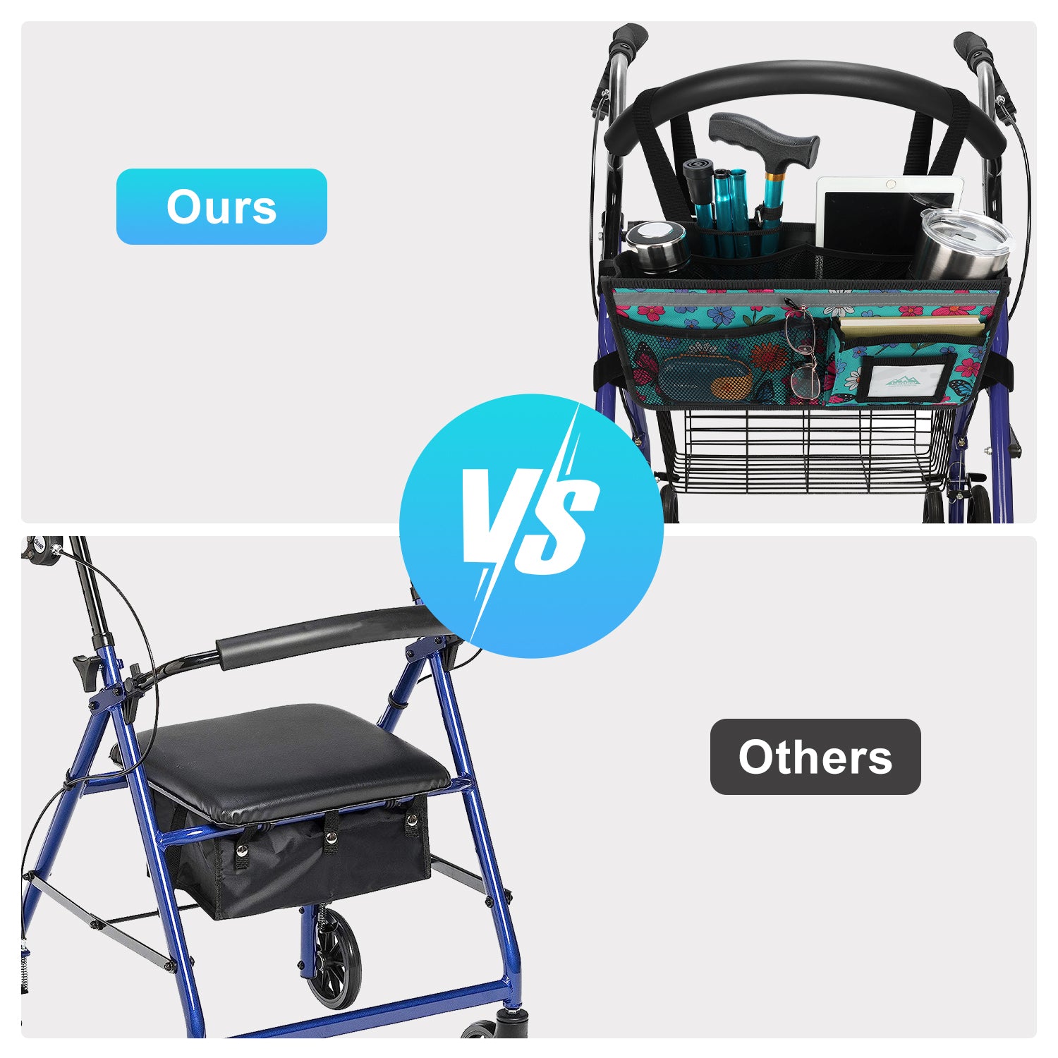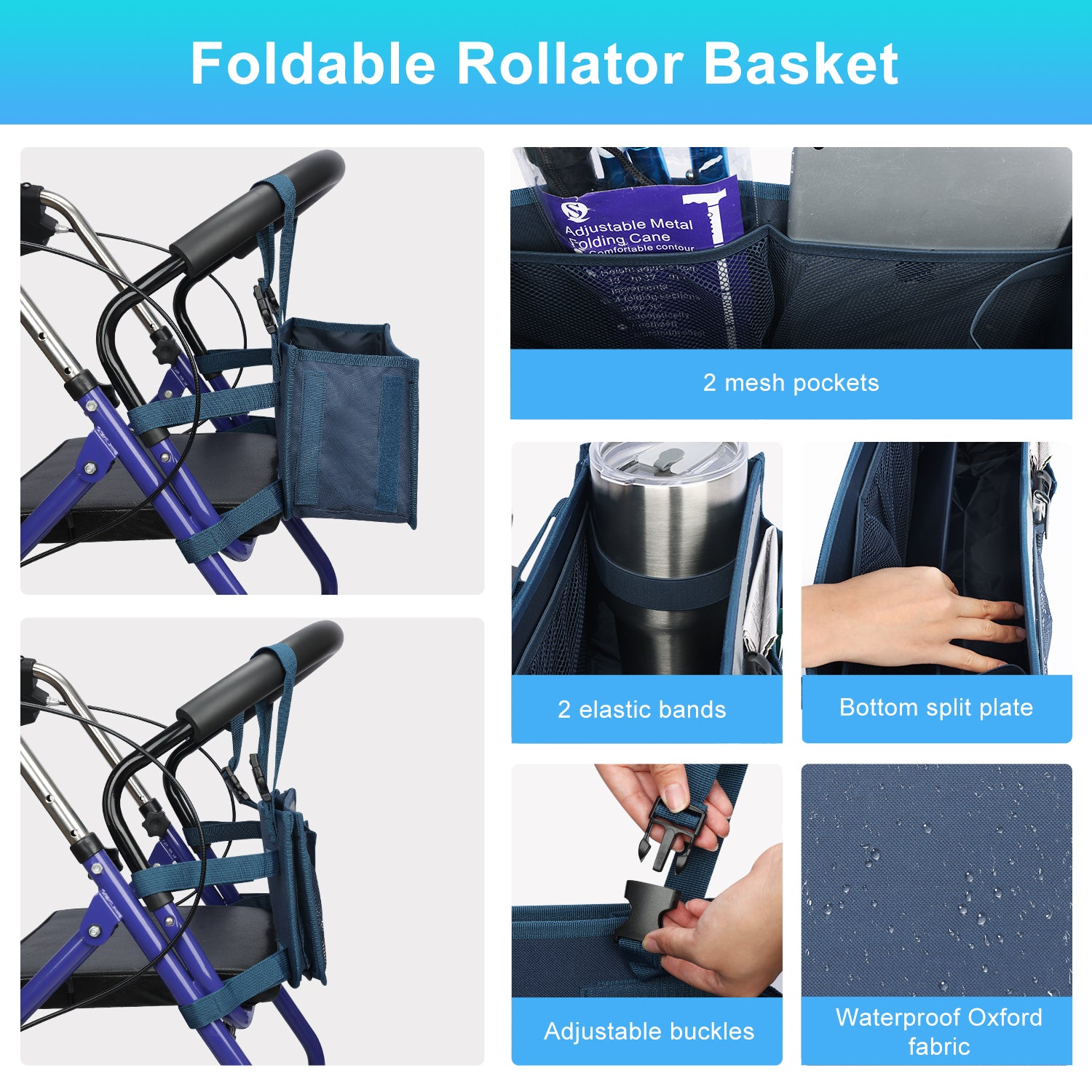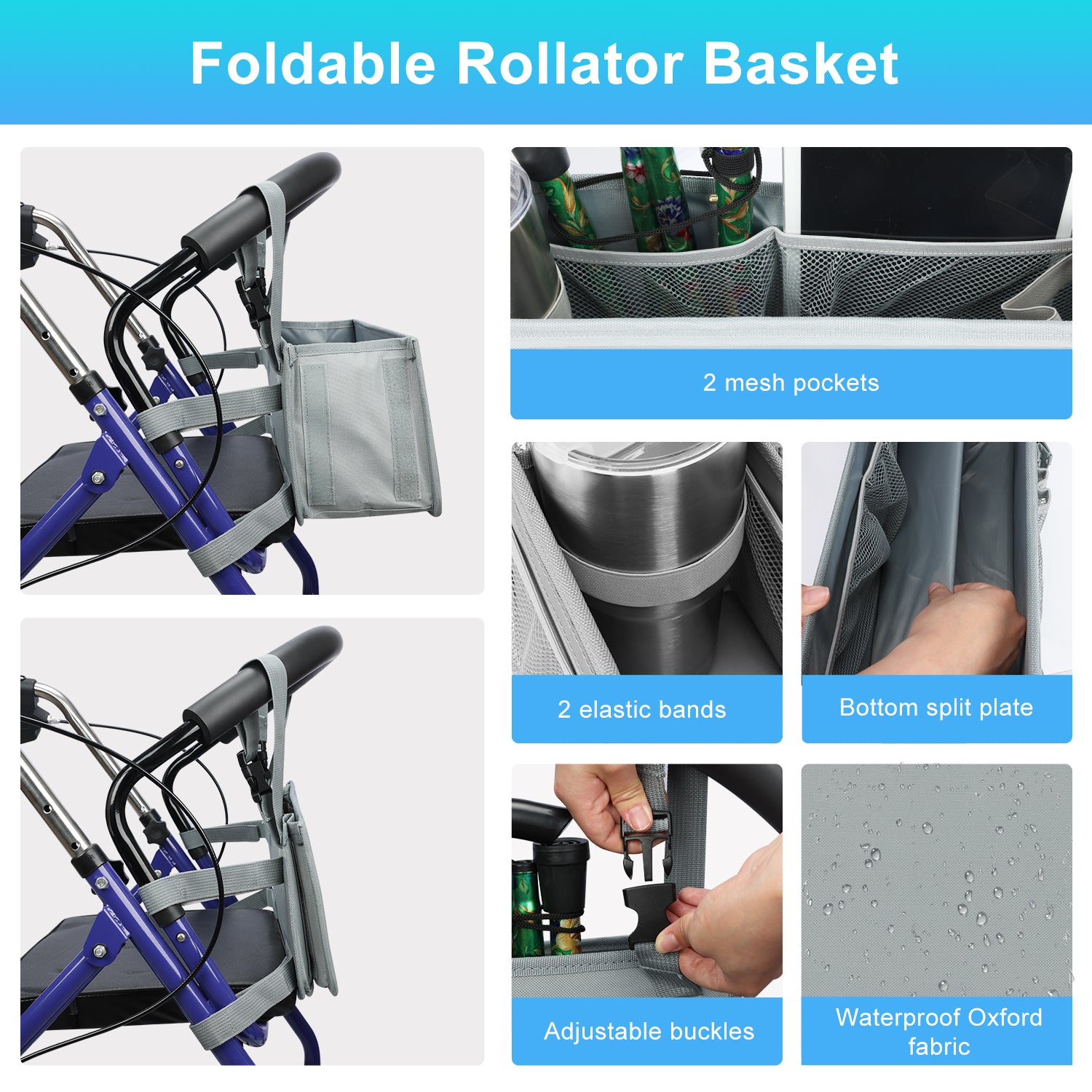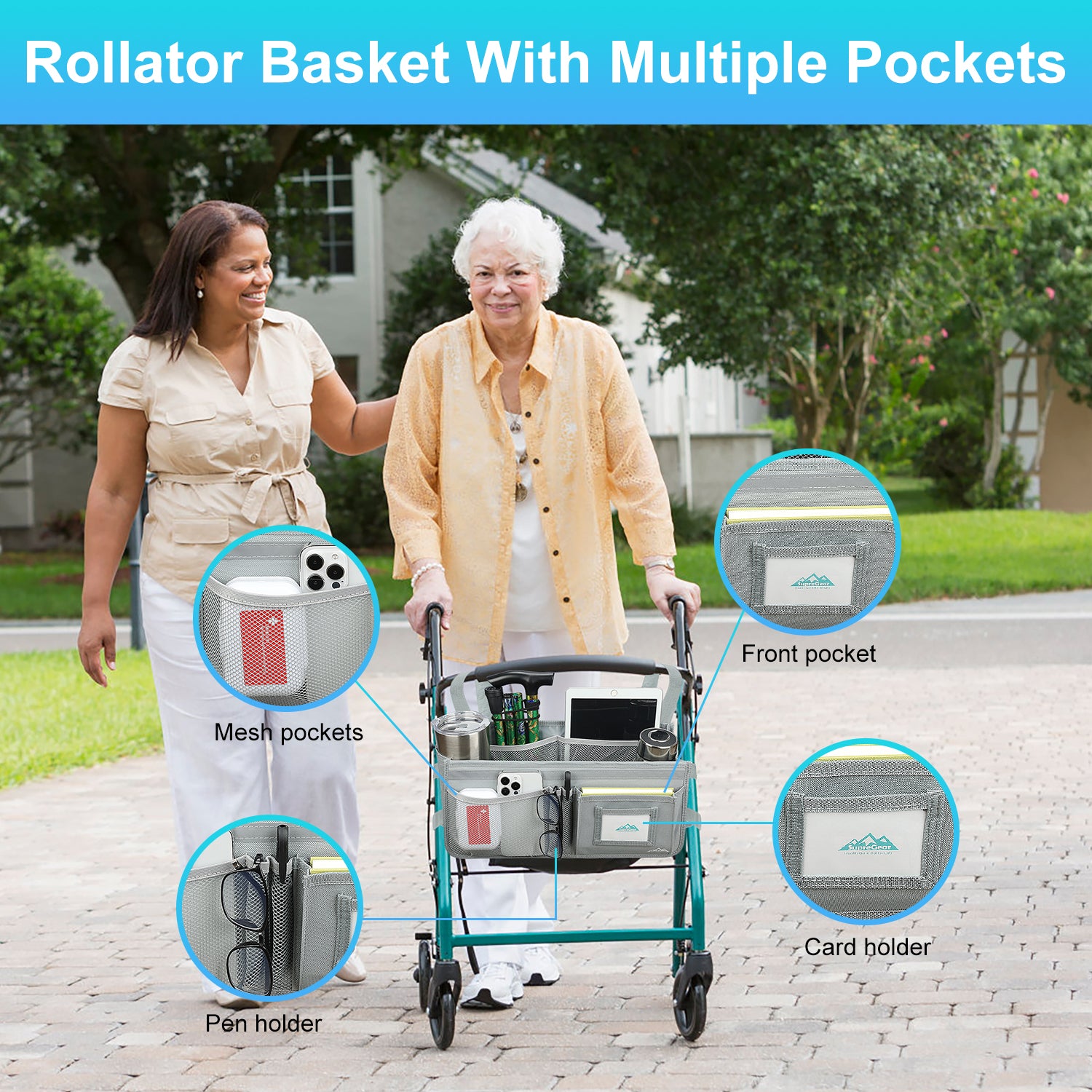 - The SupreGear basket for rolling walkers has ample storage space with its 3 insulated mesh pockets, 1 roomy pocket featuring a card holder, 2 pen pockets, and a large inner pocket for quick and easy storage of your phone, glasses, snacks, wallet, books, clothes, and other important items; equipped with 2 elastic bands to secure your water cup or bottles and prevent them from turning over, making it a versatile and practical solution for carrying all of your essentials
