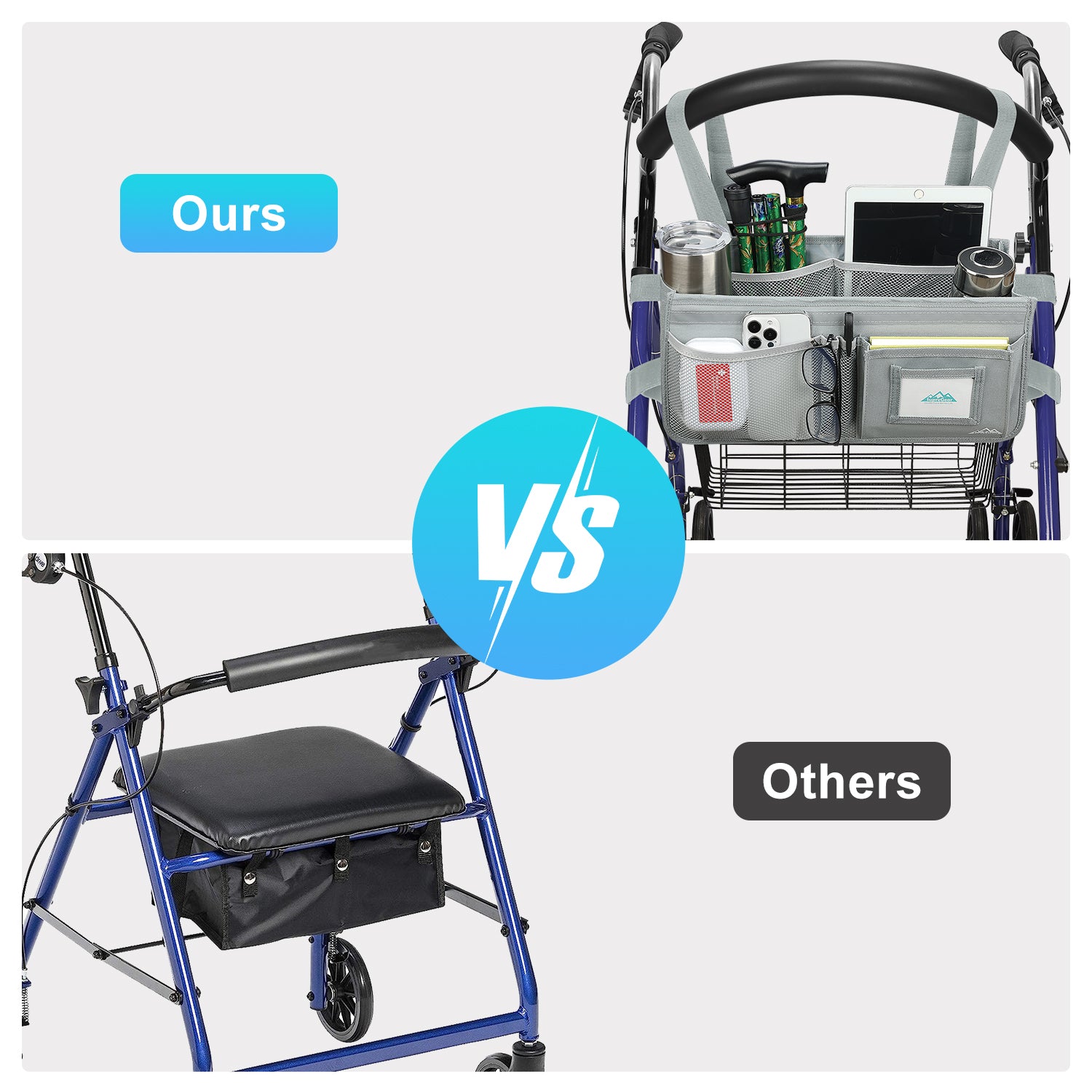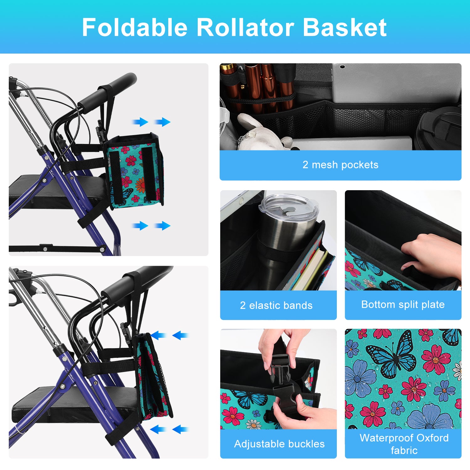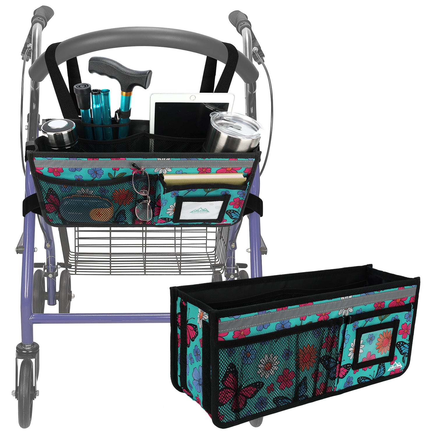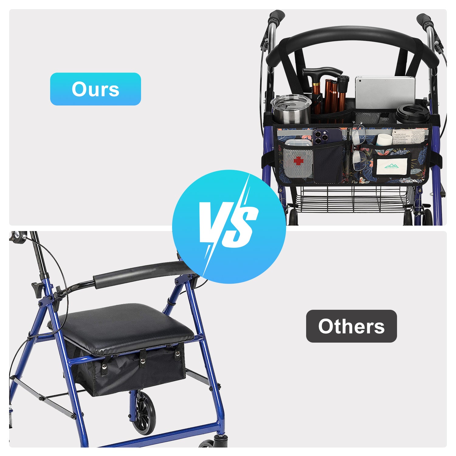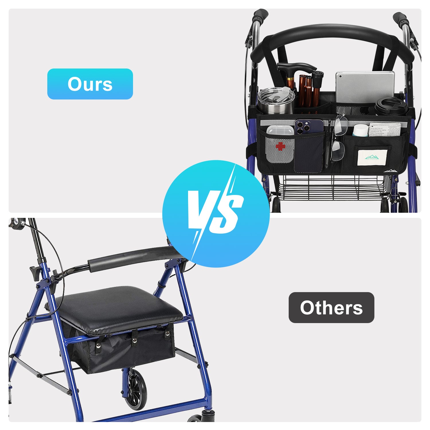 - The SupreGear basket for rolling walkers has ample storage space with its 3 insulated mesh pockets, 1 roomy pocket featuring a card holder, 2 pen pockets, and a large inner pocket for quick and easy storage of your phone, glasses, snacks, wallet, books, clothes, and other important items; equipped with 2 elastic bands to secure your water cup or bottles and prevent them from turning over, making it a versatile and practical solution for carrying all of your essentials