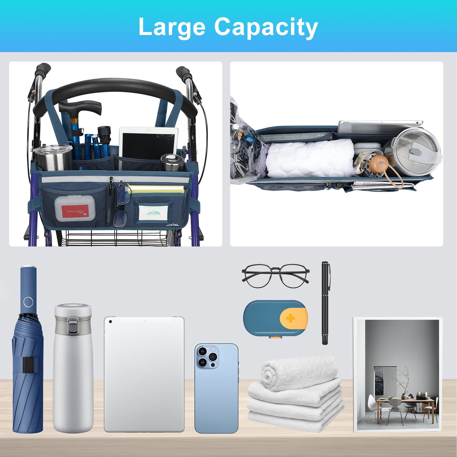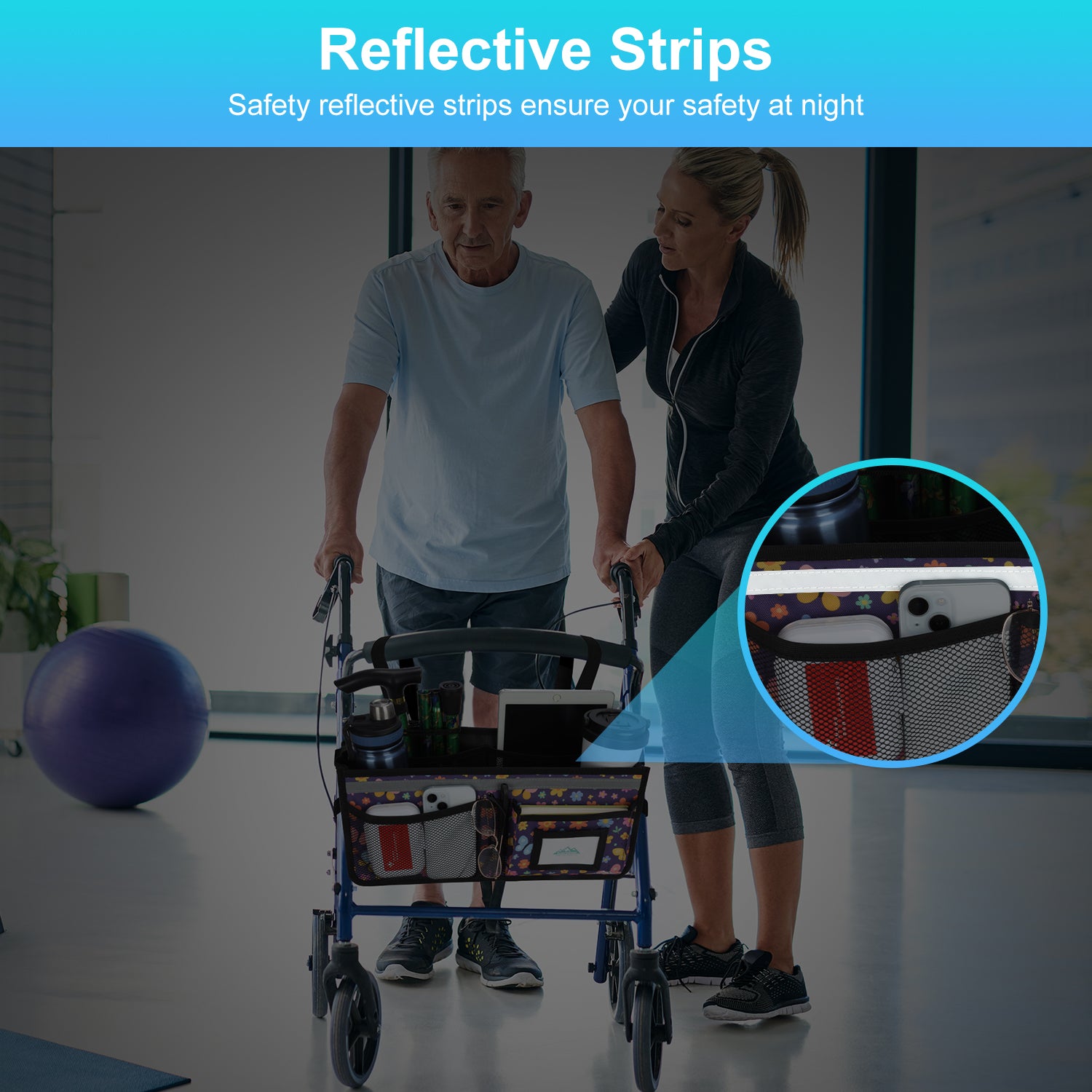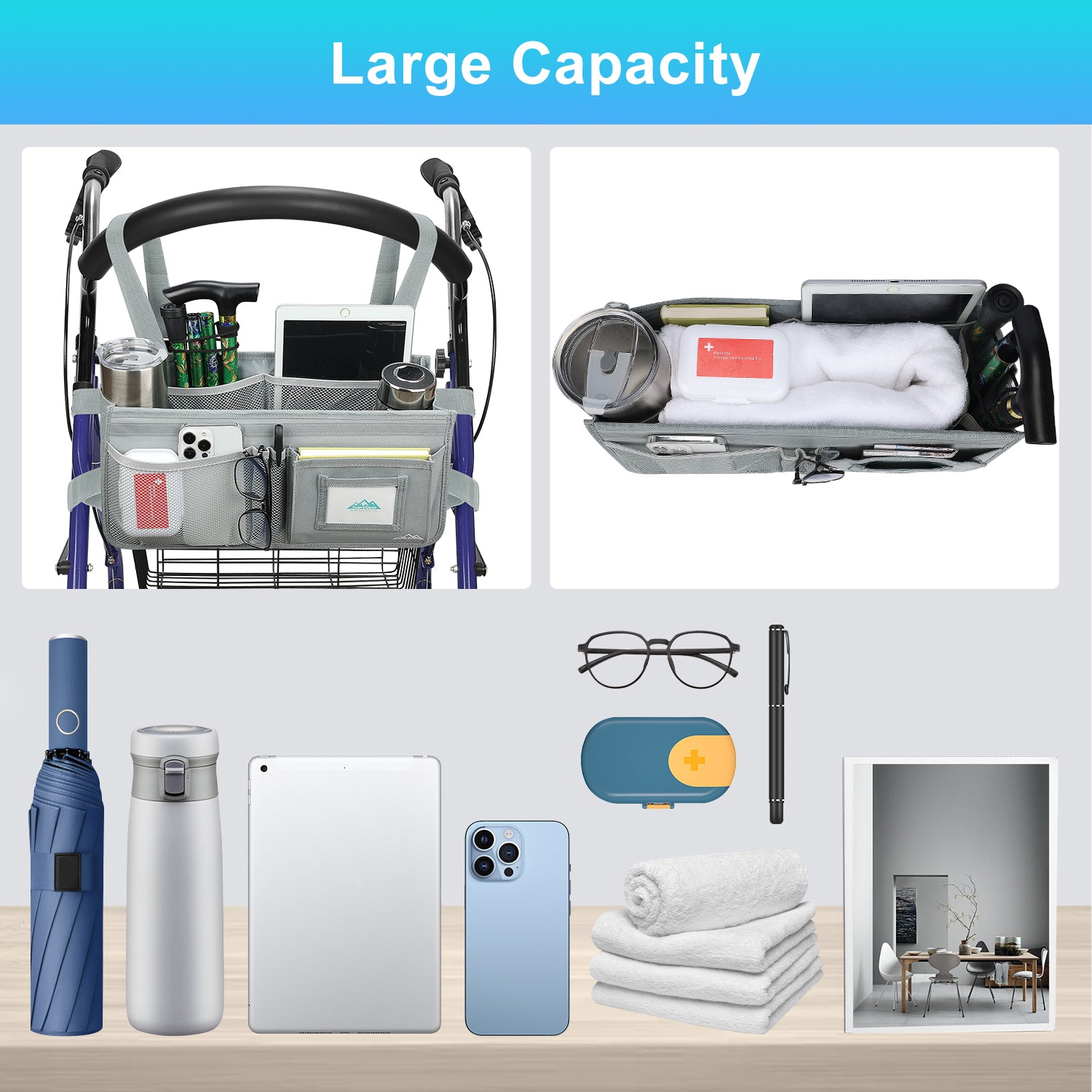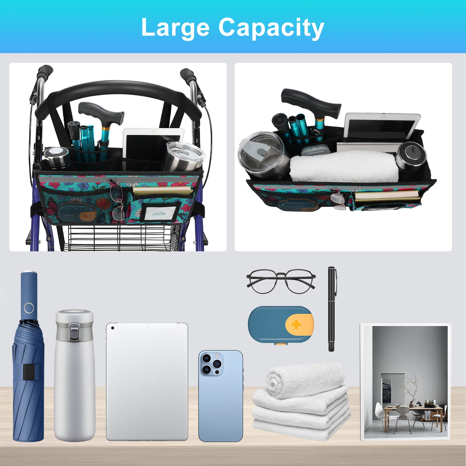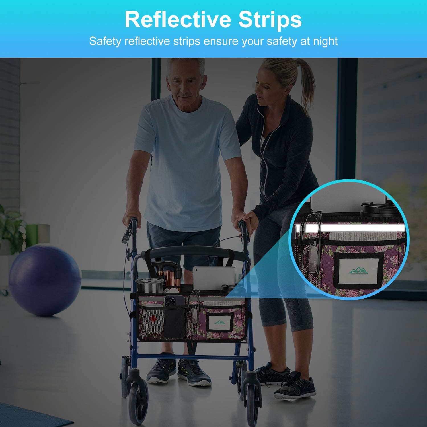 - The SupreGear basket for rolling walkers has ample storage space with its 3 insulated mesh pockets, 1 roomy pocket featuring a card holder, 2 pen pockets, and a large inner pocket for quick and easy storage of your phone, glasses, snacks, wallet, books, clothes, and other important items; equipped with 2 elastic bands to secure your water cup or bottles and prevent them from turning over, making it a versatile and practical solution for carrying all of your essentials