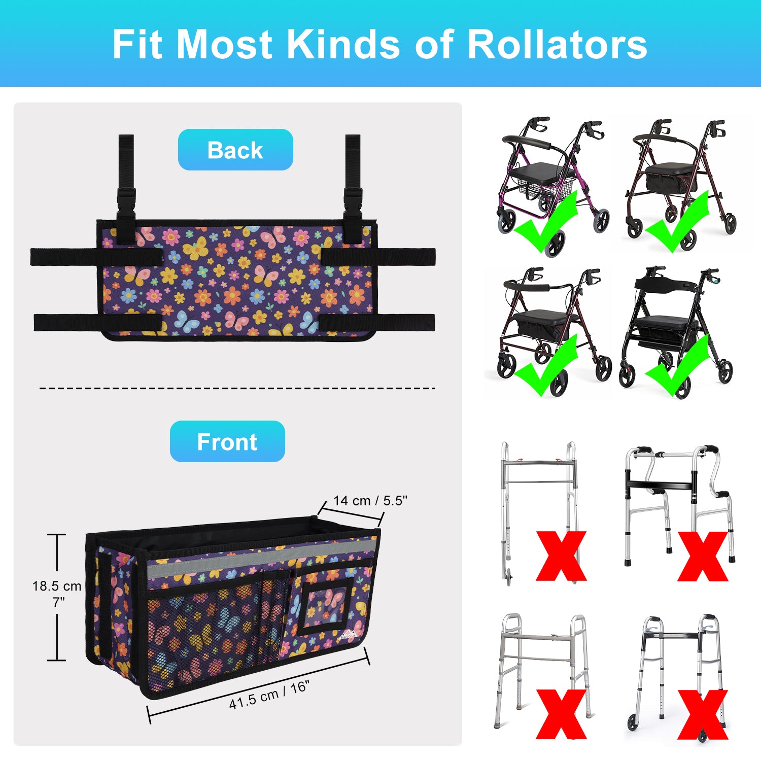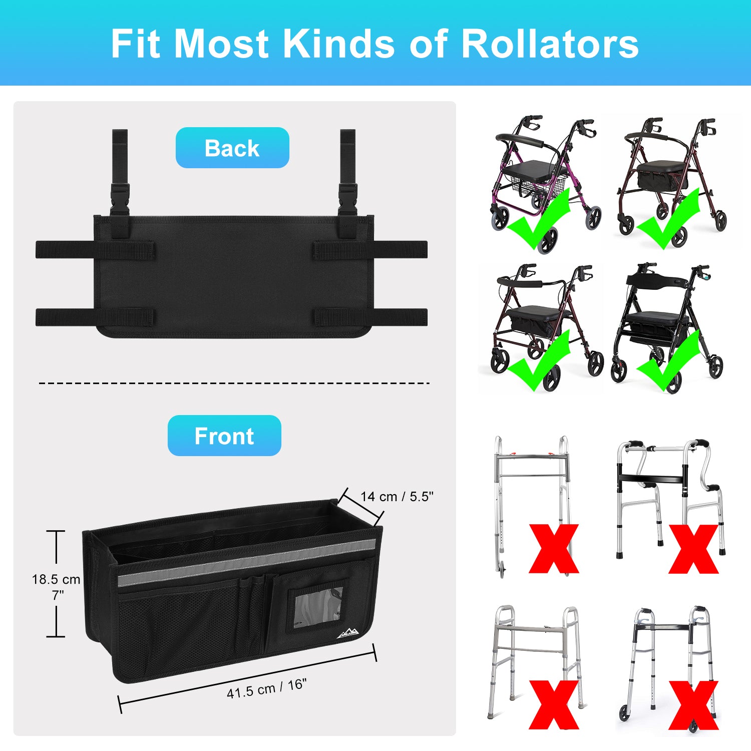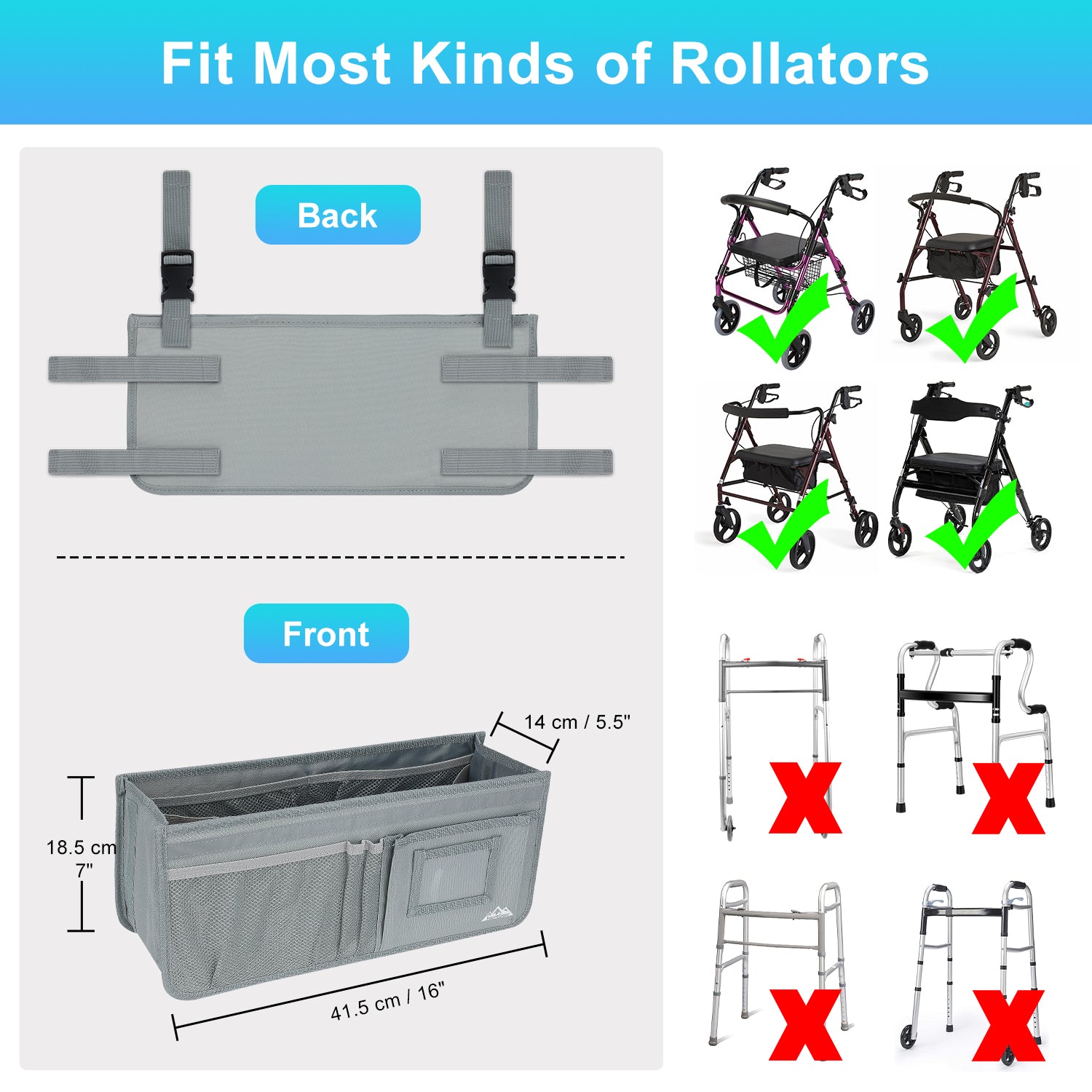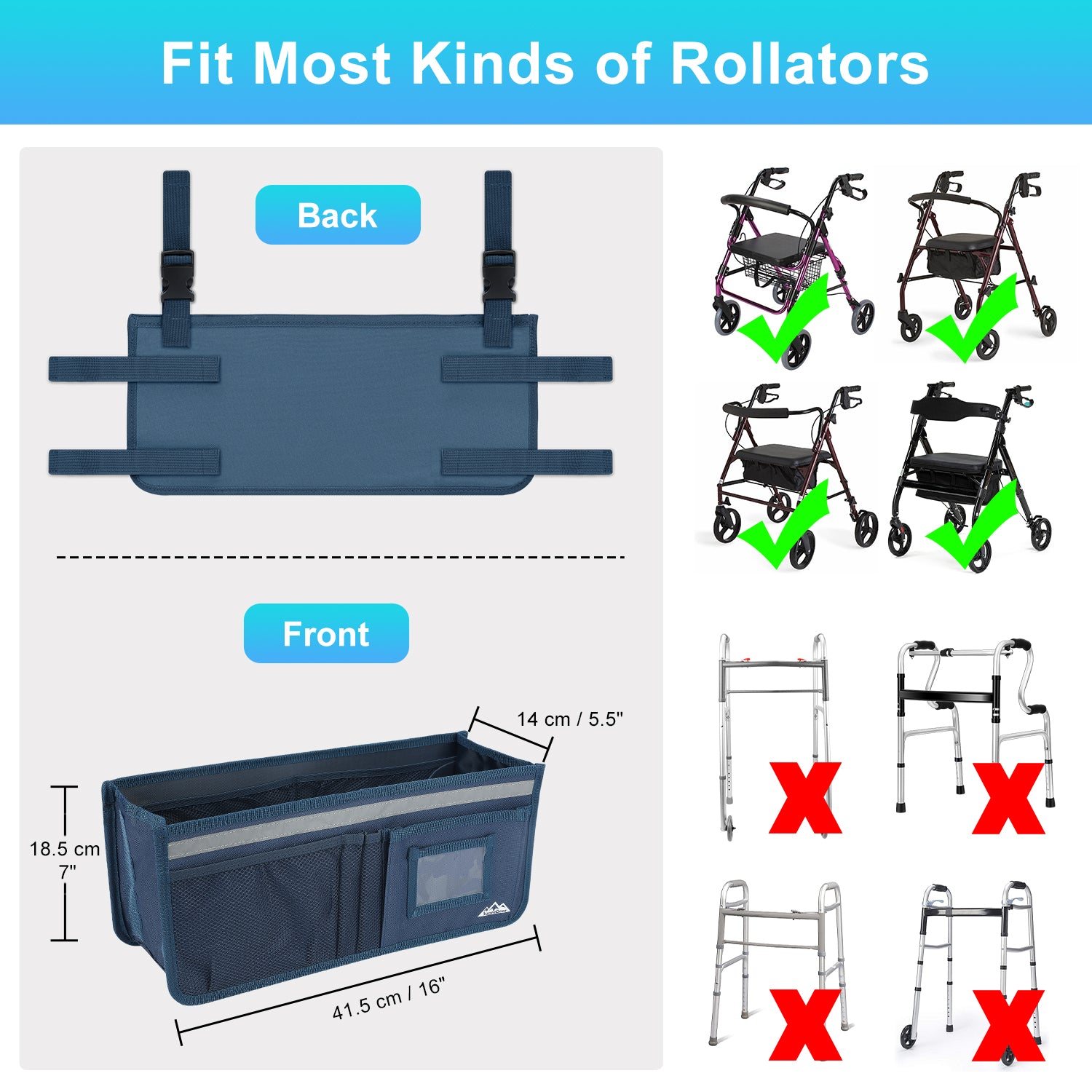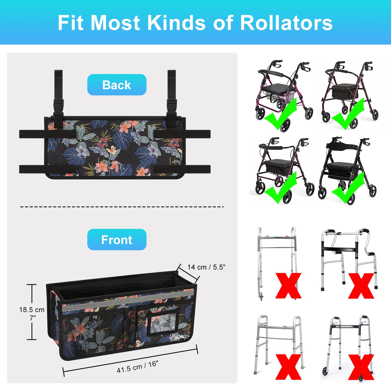 - Designed to effortlessly accommodate various sizes and types of rolling walkers, this product is an ideal solution for keeping your everyday essentials organized and within reach; its overall dimensions measure 16.5" x 7.3" x 5.7"
