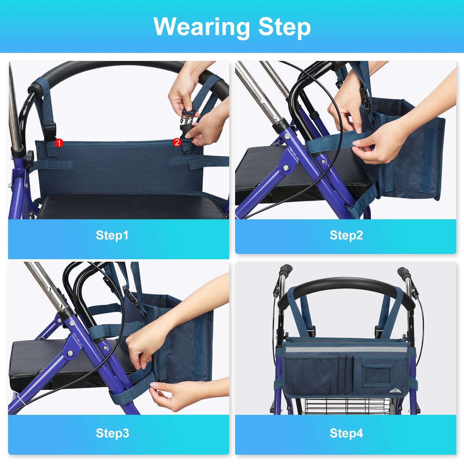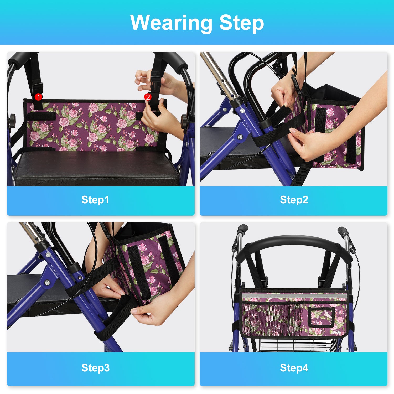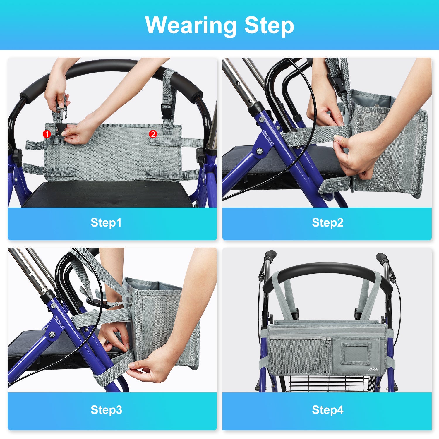 - Installation is simple, thanks to the six adjustable straps and buckles that can be quickly installed or removed in seconds, providing a secure fit; the basket can be installed stably without tilting or tipping over; the basket also features safety reflective strips to ensure your safety at night or in dim environments, making it a great help for the elderly and those with limited mobility
