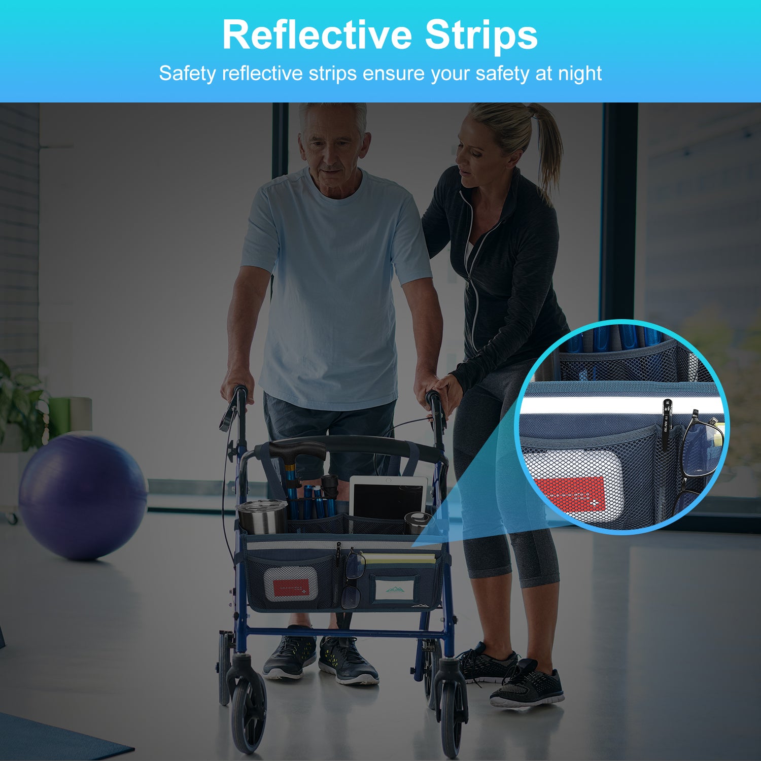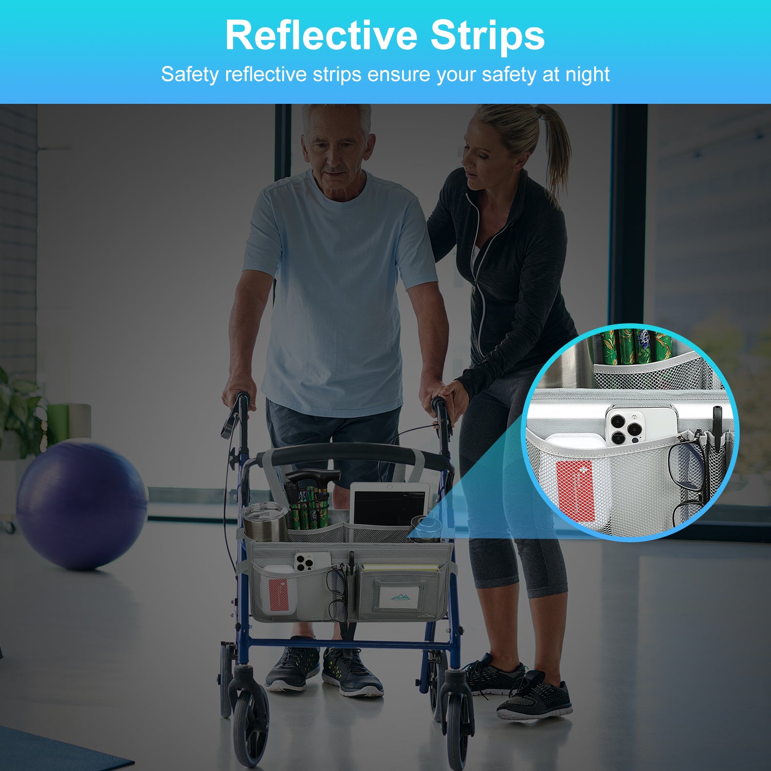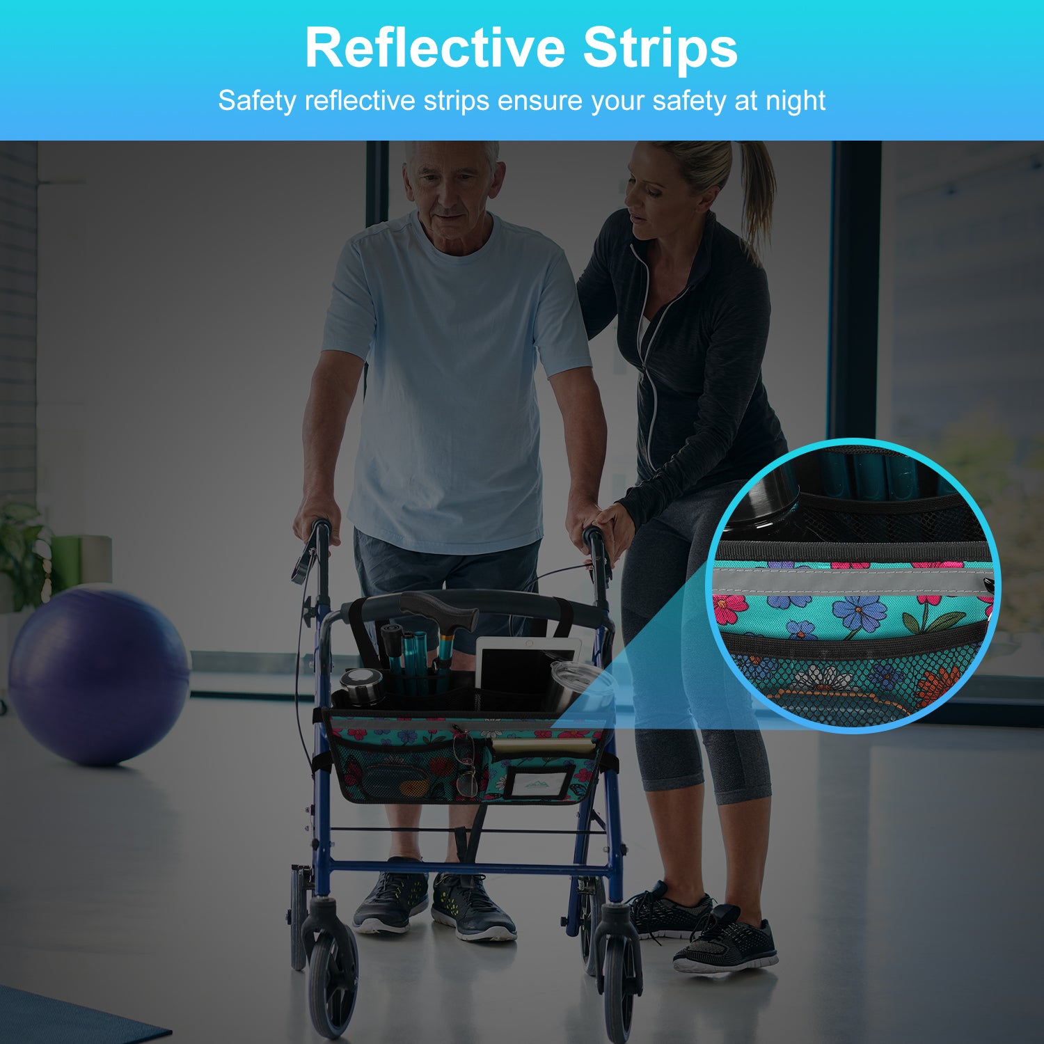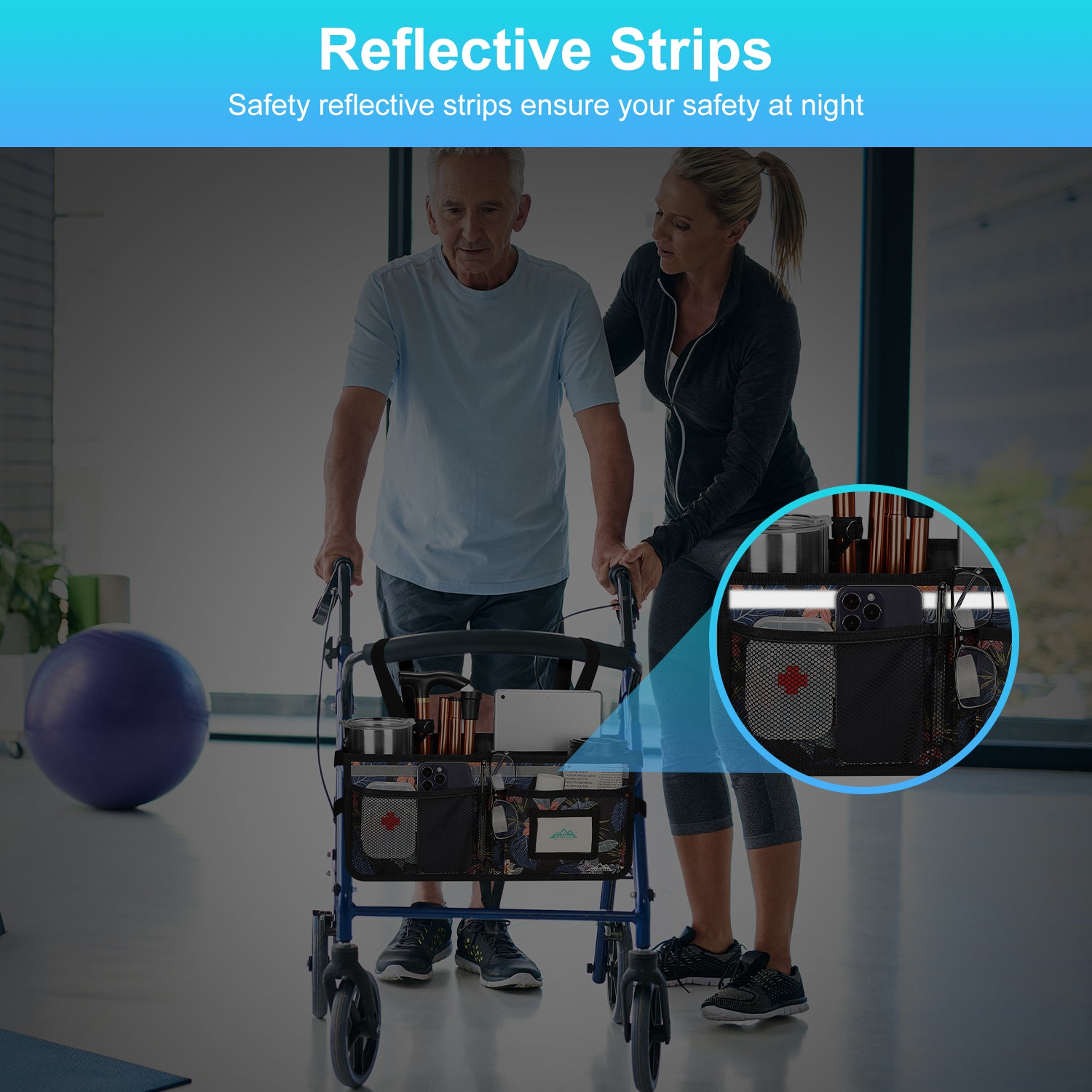 - Installation is simple, thanks to the six adjustable straps and buckles that can be quickly installed or removed in seconds, providing a secure fit; the basket can be installed stably without tilting or tipping over; the basket also features safety reflective strips to ensure your safety at night or in dim environments, making it a great help for the elderly and those with limited mobility